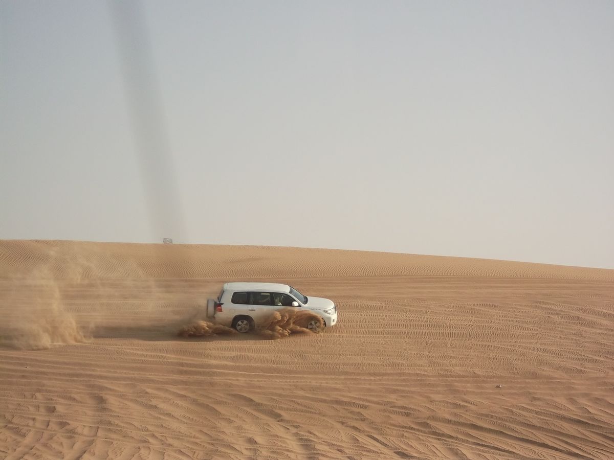 30分も走るとだんだん景色は砂漠になってきます。途中のGS兼売店でトイレ休憩があり、いよいよ砂漠に入ります。前の車に続きながら疾走するのですが、同乗していた子供達は全くの無反応。。気持ち悪かったのかな。なのでドライバーさんが気を遣ったのか、安全なルートを走行していたようです。前の車と違うルートで、起伏のないところを通っているのがわかったので、少しつまらなかったです(苦笑)