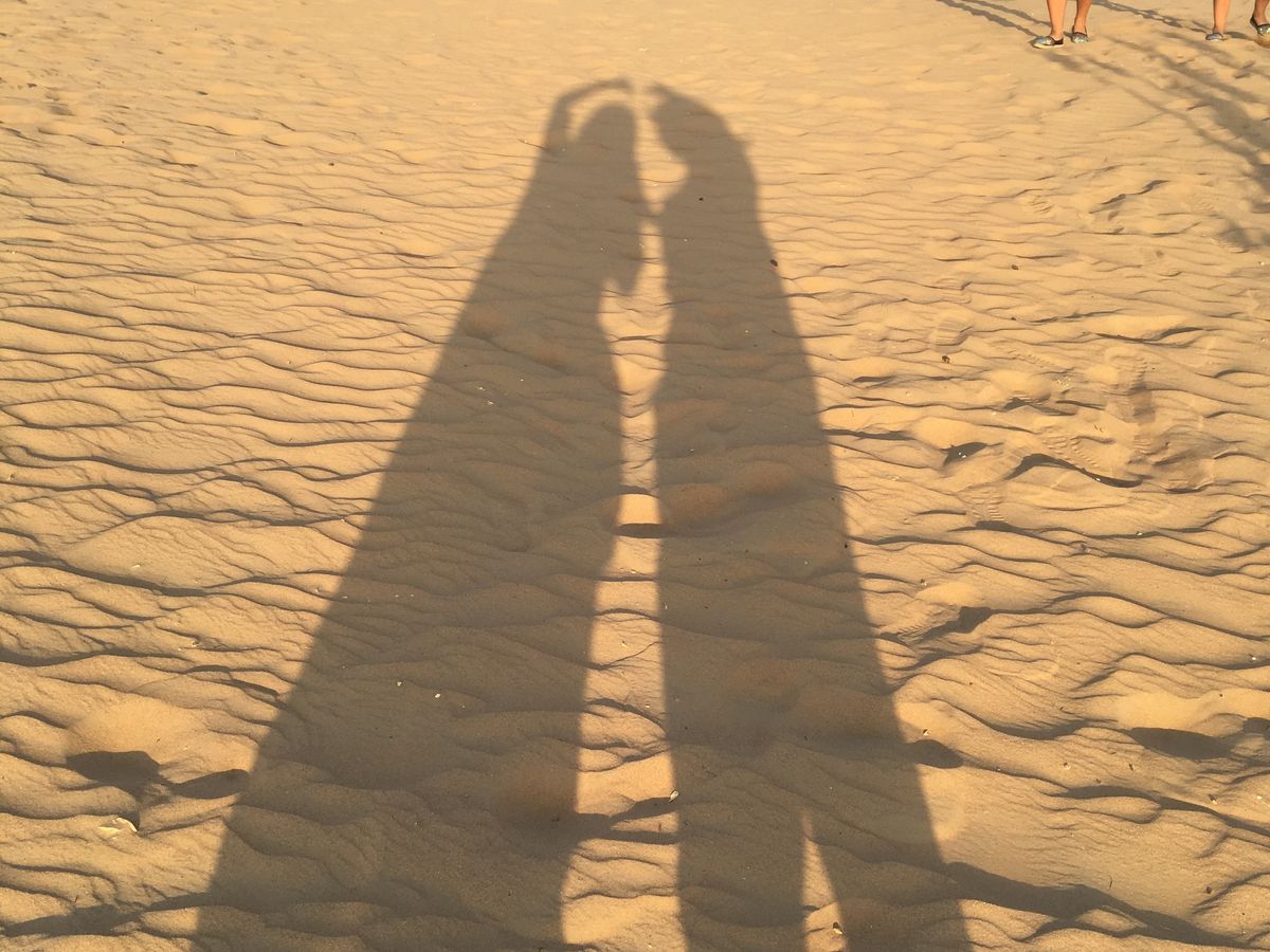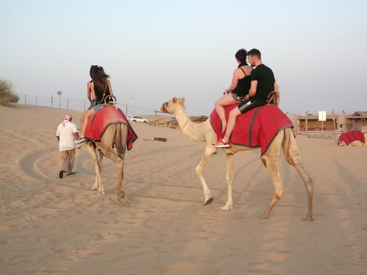 ホテルロビーに15時となっていましたが来ないのでここでいいのかと不安でしたが、15:30くらいに迎えが来ました。四駆で他の2組4人ともみんな日本人でした。途中ガソリンスタンドに寄りトイレ行ったりして出発。砂漠に着いてすぐ3分くらい?写真撮影タイム。それから砂漠のがたがた道を登ったり下ったりのドライブ!ネットの体験談で車酔いした人がいたとの事だったので、普段そんなにしませんが念のため酔い止めを飲んで行きました!でも、思っていたより全然揺れは激しくなかったです。隣の人に勢いでぶつかるような事もなかったし。途中、柵の中にラクダがいるところに止まり写真撮影。その後またしばらく車で進みキャンプ地へ日没少し前に到着。すぐラクダ乗りスタート!一頭に2人ずつで3頭連なって一周します。かなり短い距離です。夕日バックでラクダに乗っているところを写真撮りたかったのですが、列にすぐ並ばなかったため、乗る時には沈みかけでした。あと、他にもヘナタトゥー、水タバコ、アバヤの貸し衣装、サンドボード、サンドアート販売と色々あって楽しみにしていたのですが、先にサンドアートのところに行きしばらく見ていたり自分のを作ってもらったりしていると、気づけば暗くなりだしてきて、他の催しが終わっていた‼︎( ̄◇ ̄;)砂漠で夕日バックで写真もとりたかったのにそれすら出来ず...本当に残念でしたT^T 完全に順番を間違えました‼︎ しかも、サンドアートの販売だけは最後までやっていたので(ー ー;)