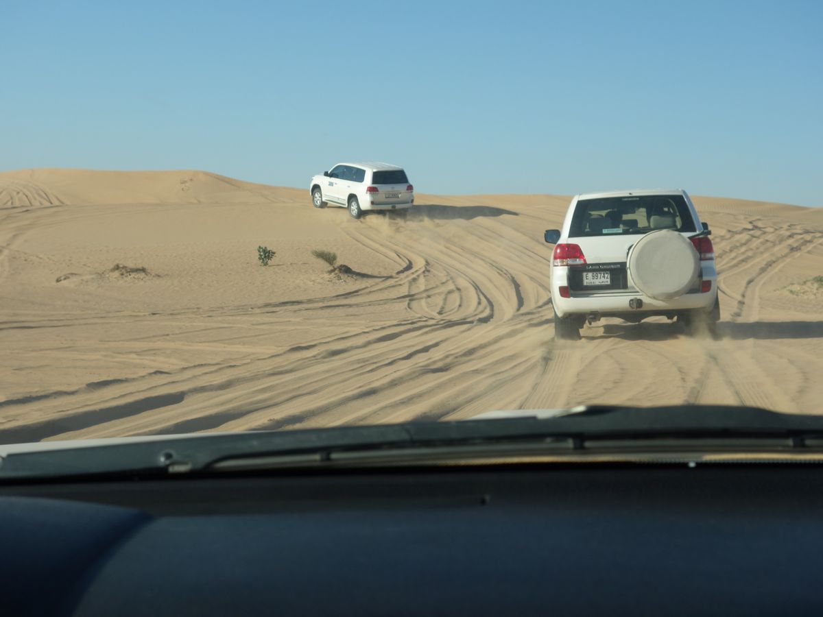 砂漠をバックに記念写真を撮っている間に、ドライバーさんがタイヤの空気を抜いて準備を着々と進めていました。砂漠サファリは思ったよりも動きが激しく、朝食は少なめのほうがいいかもしれません。都度ドライバーさんが具合が大丈夫か心配してくれるので本当に危なかったら申告しましょう笑。