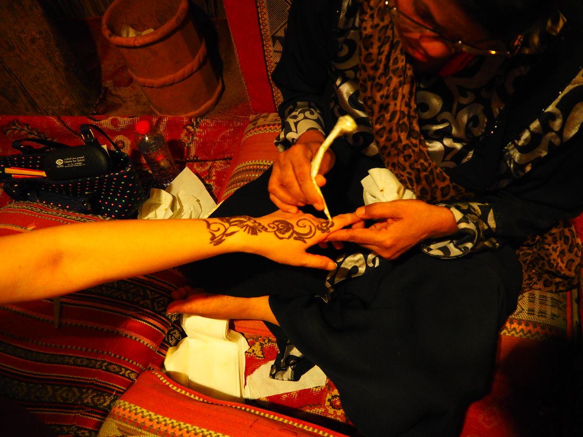 サイトは円を描くように、サンドアート(売店)、シーシャ(水タバコ)、ヘナ、ちょっとしたお土産物屋さんがあります。事前にアラブ衣装を申し込んだ場合は、係の人が呼びに来てくれますが、突然やって来てそのまま建物の裏に呼ばれるので、心配な人は荷物を持って行ったほうがいいと思います。私たちの場合は近くに同乗のオーストラリア人一家がいて「(荷物を)見ていてあげるから大丈夫」と言われました。