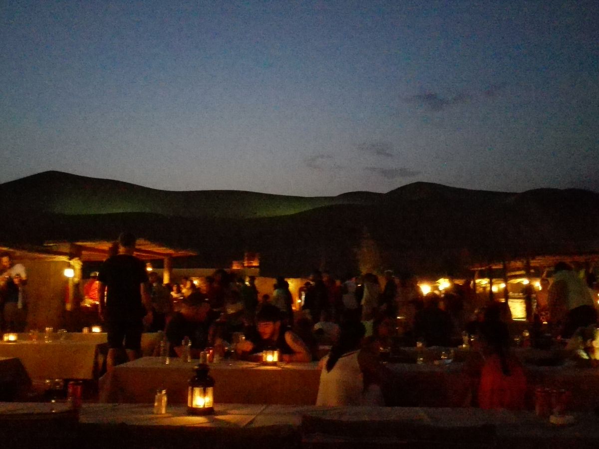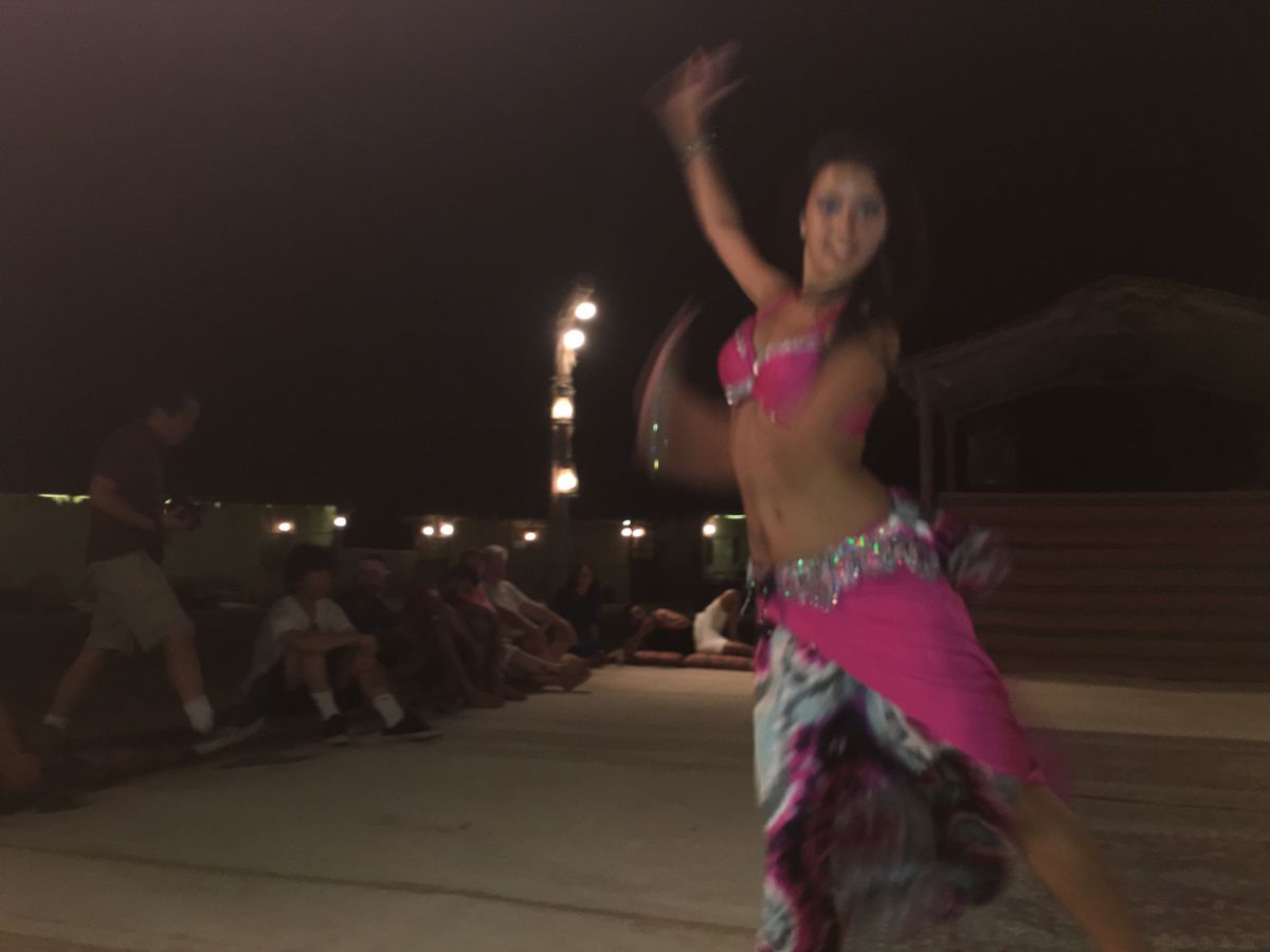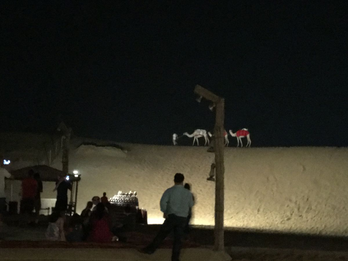 要所で停車し砂漠の中で記念撮影をした後に、夕食会場に到着するとラクダの群れがお出迎え。順番に乗せてもらってまた記念撮影。その後夜空の下でアラブ料理がビュッフェ形式で振る舞われました。最初種類が少ないなあと思ったら、それは前菜。後に肉料理などもどんどん出てきておなかいっぱいになれました。味も良し。しかもお酒飲み放題。出し惜しみなし。ベリーダンスもキレキレでお見事でした。トイレも綺麗で申し分ありません。