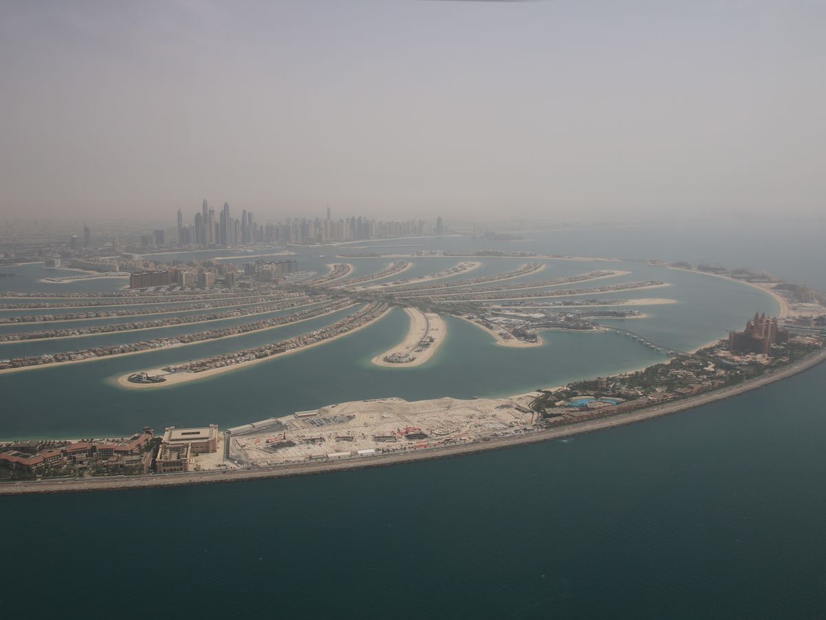 世界一高いビル、ブージュカリファ付近を通過した後、世界一の人工島、パームジュメイラ上空へ。私達はここに泊まりましたが、地上から見るのと上空から見るのとでは雲泥の差。不思議な形の島にホテルや豪華別荘が建ち並ぶ様は壮観でした。