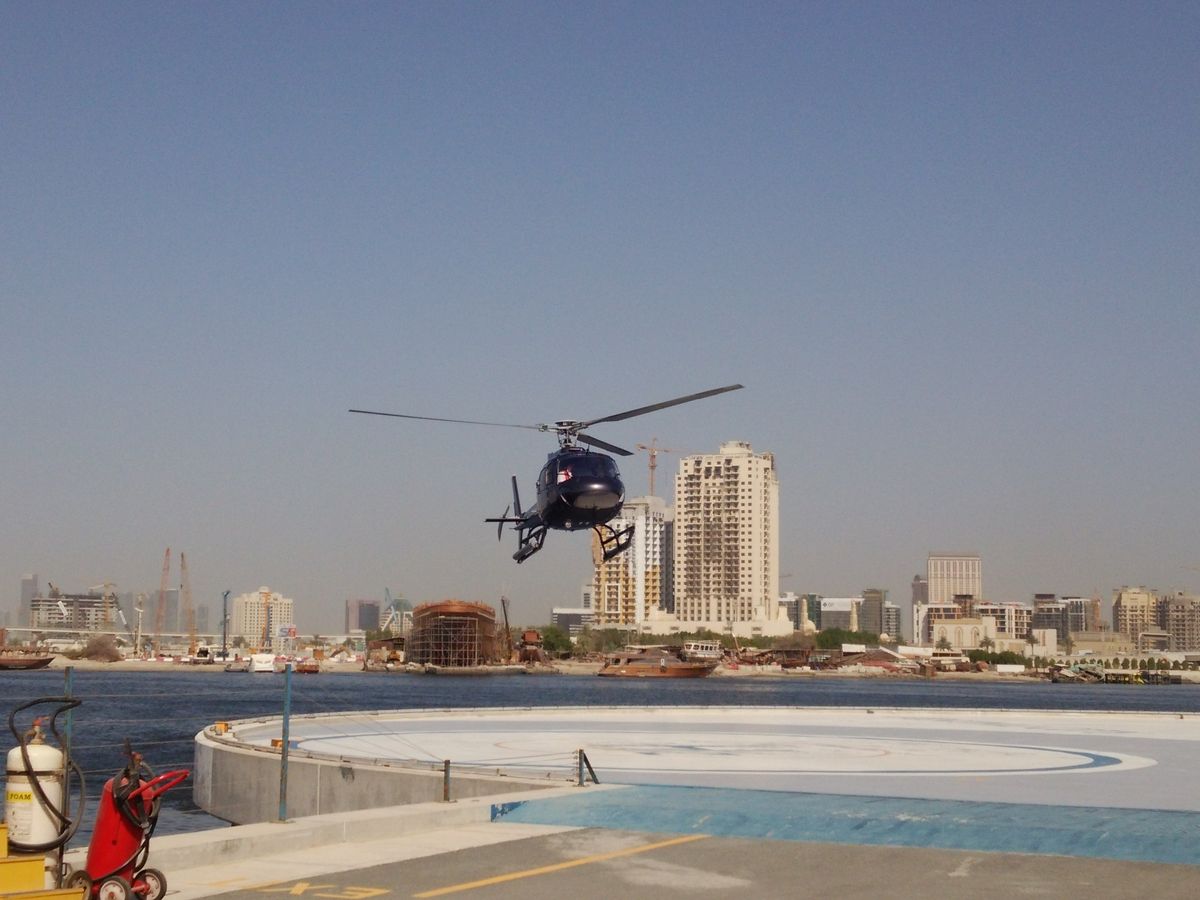 ヘリの発着場所はドバイ国際空港近くのドバイクリーク(運河)沿い。ホテルまでの送迎をお願いしたため無事つけましたが、とても分かりづらい場所なので、自力で現地に着くのは至難の技と思います。