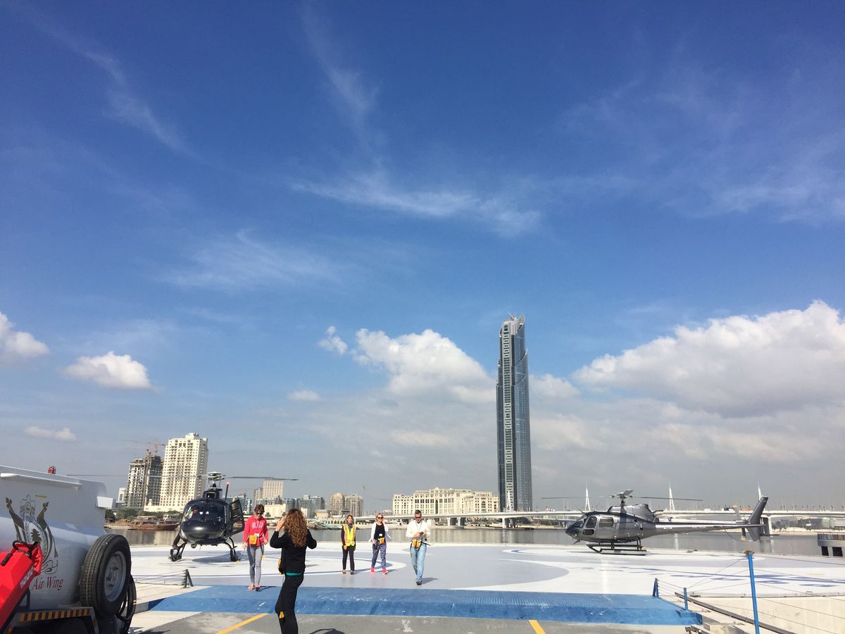 ドバイの街並みをヘリコプターで見て回る。