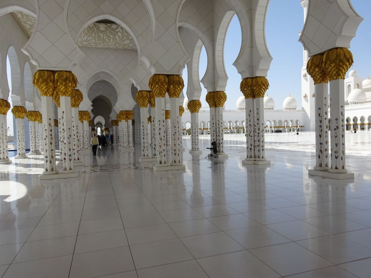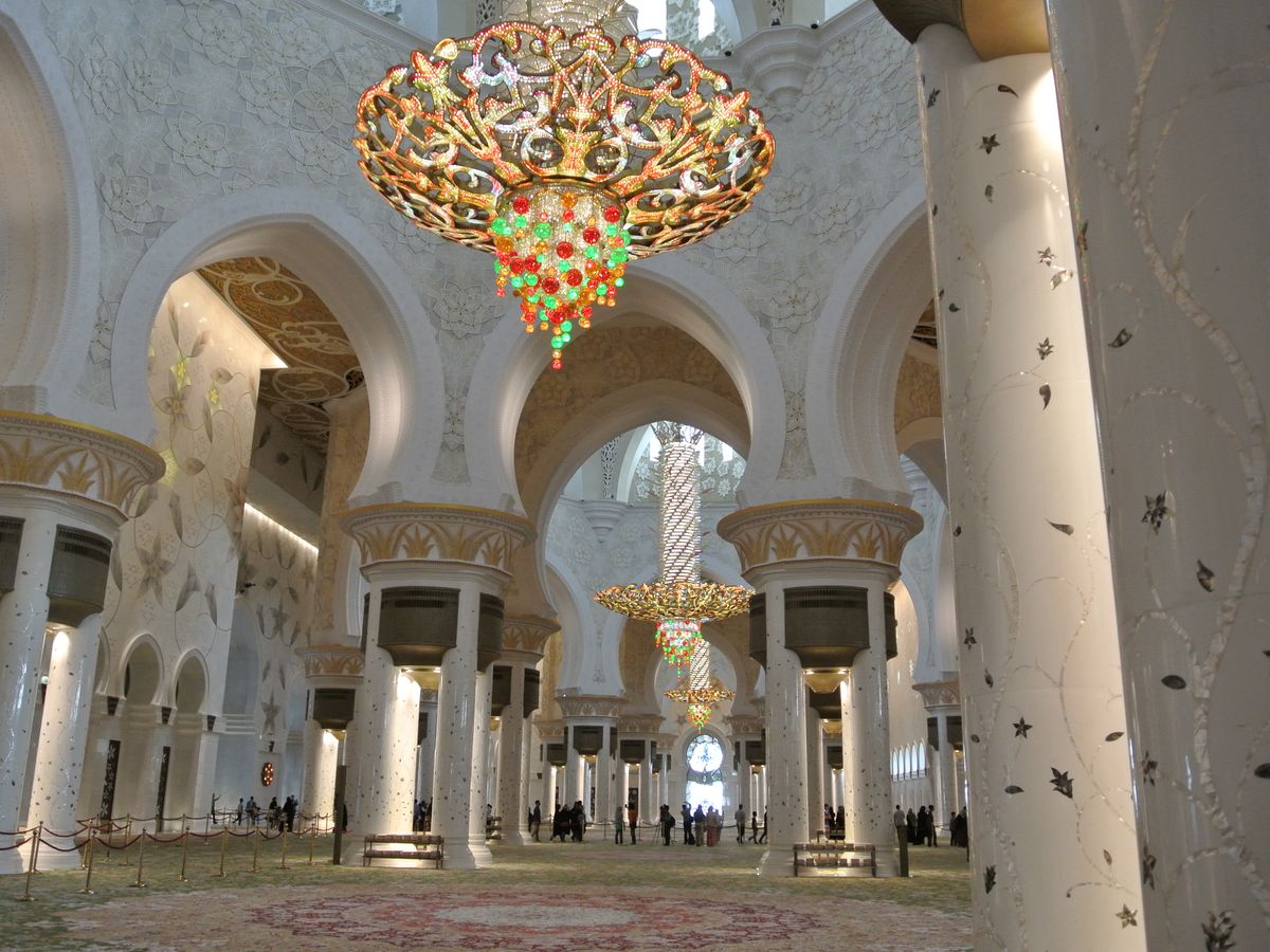 さて服装チェックをパスすると、抜けるような青い空に 太陽の光に照らされて真っ白に輝くモスクがそびえ立ち、一瞬目を疑うような美しすぎるモスクです。入場した途端に目が奪われます。内装も美しいく、館内に敷き詰められた世界最大の手織りカーペットはペルシャ絨毯で。1300人の職人さんたちの手によって織られたそうで圧巻な出来栄えです。カーペットの踏み心地は滑らかでフカフカ。全てスワロフスキーで出来たシャンデリア。壁には大きなイスラム時計に一日5回行うという礼拝の時間がデジタル表示されていています。何時でも何処でも、聖地メッカの方向まで教えてくれるという至れりつくせりです。