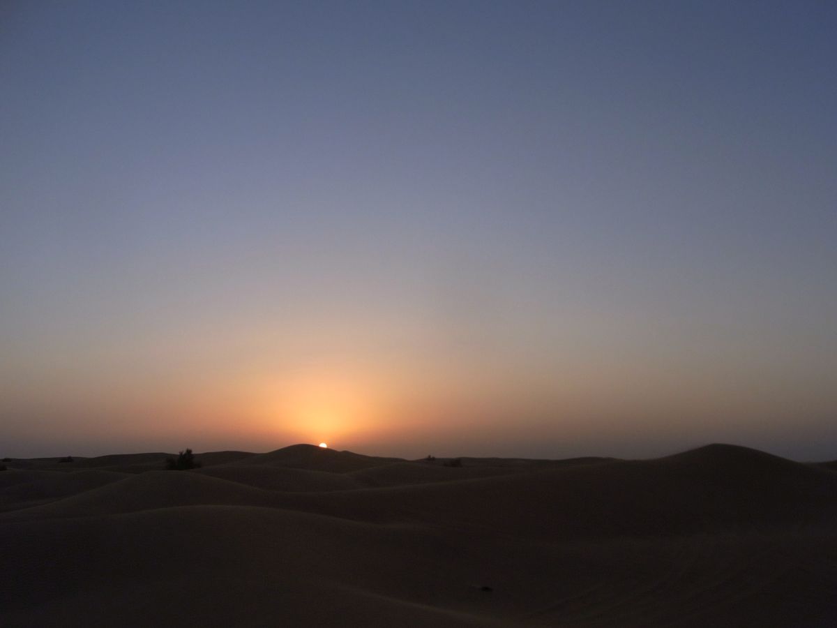 そして、休憩場所に到着。ここでカメラを手にとって待ち構えているのは・・・雲ひとつない空で、砂漠を駆けのぼり上りきって待ち受けたのは、どこまでも続く砂と空。遮るもののない地平線に沈む最高の夕日と、砂漠に描かれた波紋と風…こんなにも夕陽って赤いんだと思えるぐらいの最高の夕焼けでした。地平線に沈む夕日は中々見れる物ではないので、この夕焼けを見れただけでも、このツアーに参加した価値があると感じました。