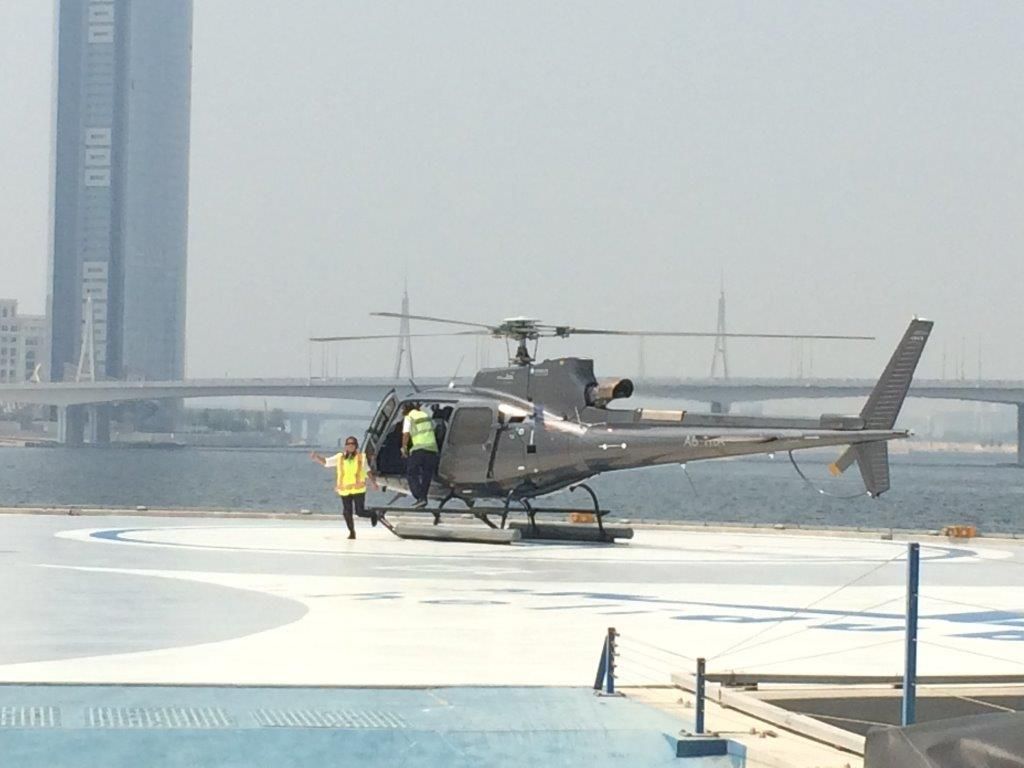 私はワクワクする気持ちを静め、ドバイの地に足を踏み進めました。そうです、今回の旅の第一希望である、ヘリコプターに搭乗することです。この事は前日まで息子が私へのサプライズでした。ですから嬉しさ100倍です。定刻に待合室に行き、係の人に注意説明を聞いている間も、耳は上の空。なぜなら、私の目の前で私を待機しているヘリコプターに目と心は釘づけ・・・