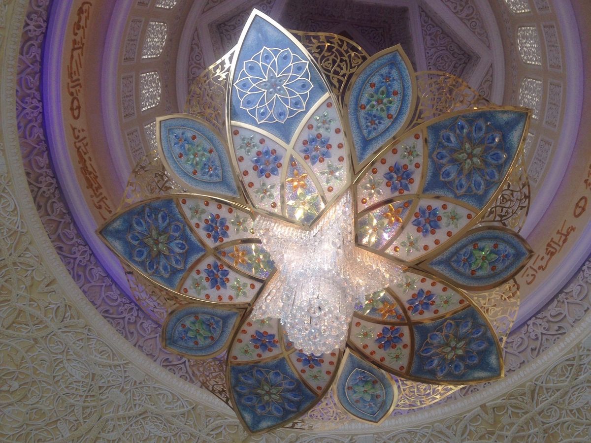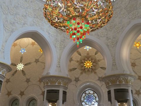 モスクの中にキレイなシャンデリアがあるんですが、モスク内で写真はOK。でもポースをとっての写真はNGです。監視員にカメラとられて削除されました。