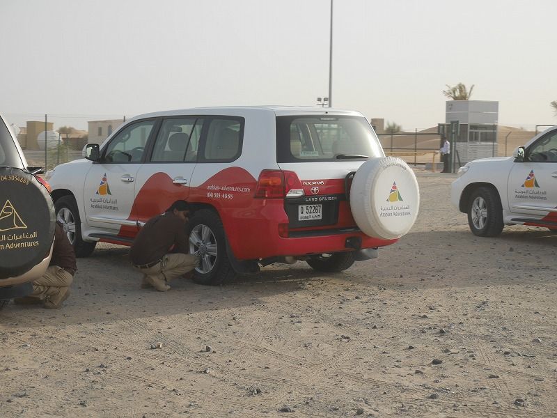 砂漠入場前に、タイヤの空気圧調整が入る。空気圧調整も非常に念入りで安心。