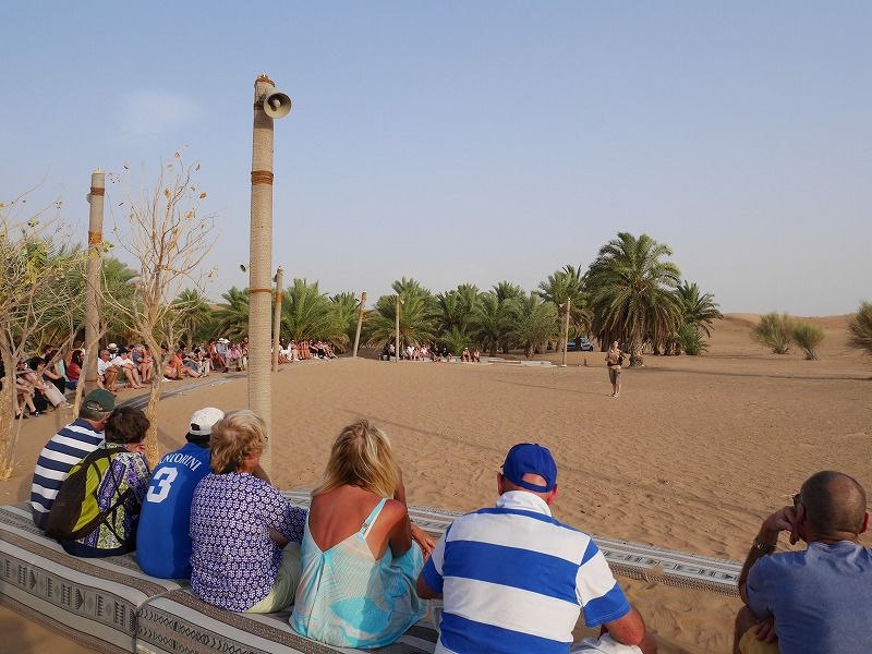 先ず入り口前にラクダが待機、ここでラクダ騎乗。ラクダ引きの人が写真も撮ってくれます(ラクダ引きに20ディルハム程度みなさん支払います)ラクダが終わると、ディナー会場へ、入口でファルコンとの記念撮影(全ての写真を選び購入できるブール有)