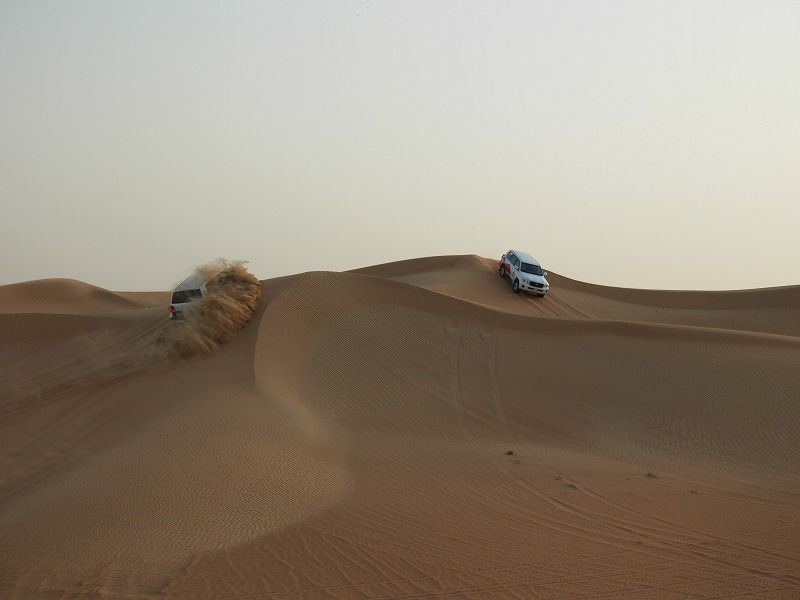 昼食後は、日本人のガイドさんとは別れて、サファリツアーの車(5-6人用)に乗り込みます。砂漠での砂丘ドライブは思ったより荒々しいドライブではなかったので、70歳過ぎの母でも大喜びでした。でもドバイの砂はとても細かく「パウダーサンド」と言われているそうなので、無意識のうちに砂を吸い込んで、車の中でも口の中が砂だらけになりました。サファリの後は、ペットボトルの水でうがいが必要かもしれません。