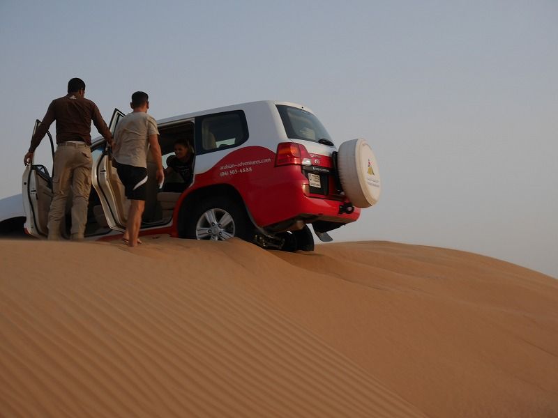 さてさて、待ちに待ったサファリです。砂漠にぽつんと家。ぽつんと大きなスタンドをどんどん進むと到着。空気を抜いていざ出陣!なんともいえず楽しいの一言です。傾きますねぇ〜