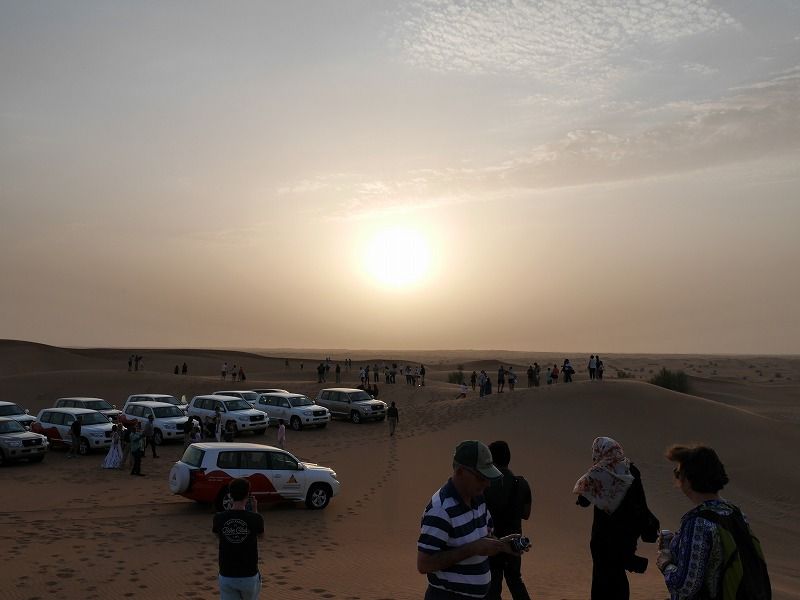 ついに、砂漠ラリーです。私たちのドライバーはとても上手で、もう車内はキャーキャーと大騒ぎ!その大騒ぎに気を良くしたドライバーがアクティブに走ってくれます。見渡す限り砂漠の中を何十台ものランクルが連なって山を登っては落ちての繰り返し!酔い止めを飲んだ方が良いと他の方の口コミにあったので私は飲みましたが、酔いやすい方は確かに必要かもしれません。 サンセットと共にライドを楽しみそして停車。フォトタイムです!みんな撮影大会。砂漠の世界の美しい景色とサンセットを楽しみます。