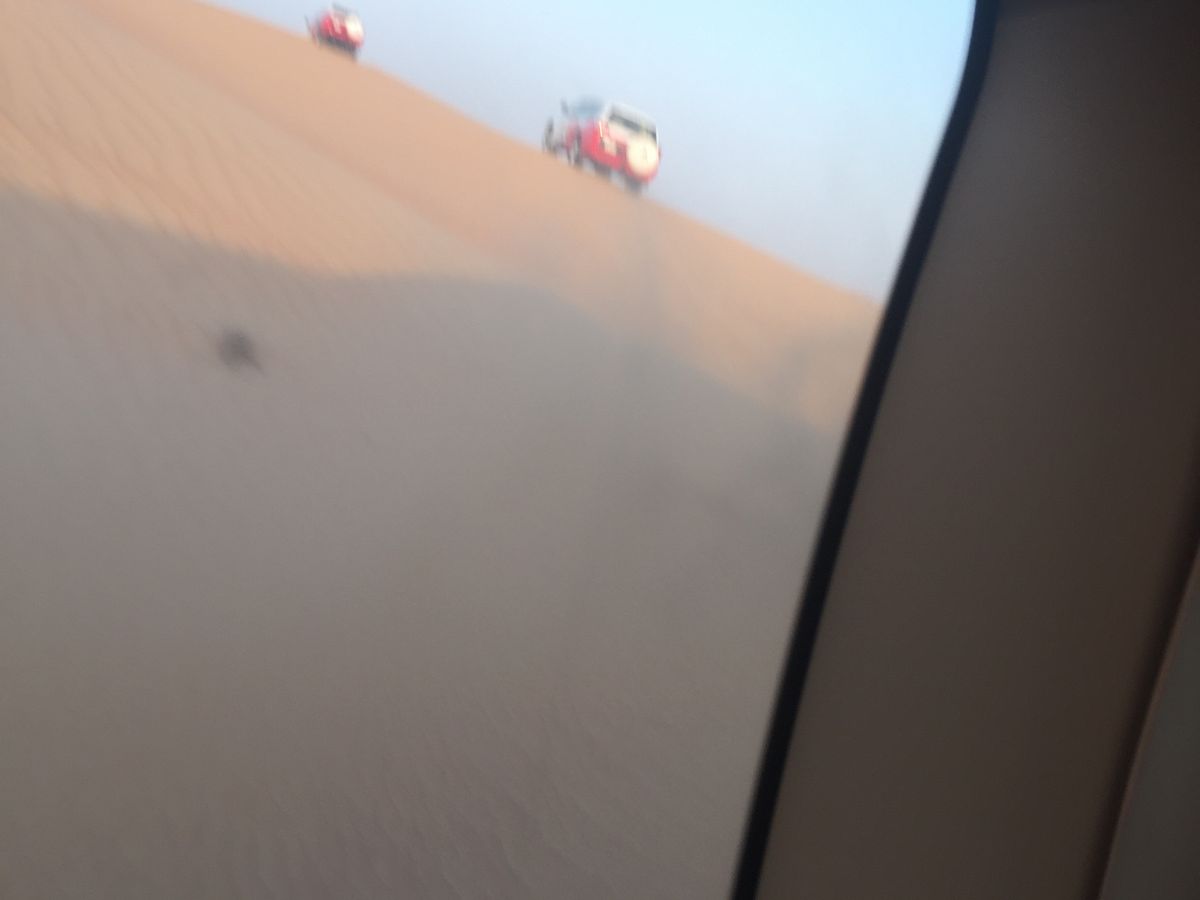 一番後ろの後部座席に乗ってた方が気持ち悪くなってました。。紙袋を渡されてたのでその袋に処理すれば大丈夫。途中、砂漠の真ん中で写真タイム。かなりの暑さと風と砂。でも砂漠にびっくり過ぎてそんなことおかまいなし!