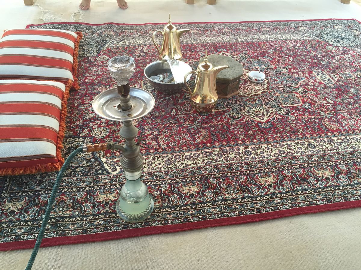 その先にクーラーボックスがあって好きなソフトドリンクを頂きながら、奥のコの字のアラブ式の長椅子に座ります。ある程度の人数になったところで、ファルコンショー(この時、風向きを確認して座る事をお進め、砂が目にはいる可能性有)
