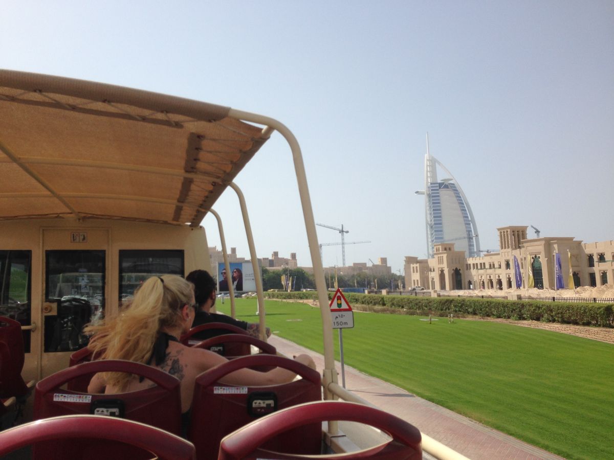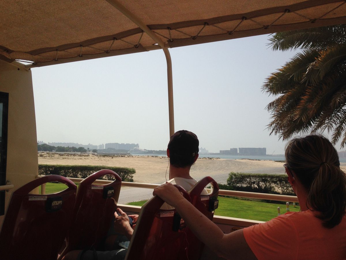 この日の気温は42度とかなり暑かった(ドバイの人にとってはそうでもないようです..)のですが、せっかくなので二階席のオープンスペースに座りました。二階席の前方はガラス張りでクーラーが効いているのですが、殆どの観光客がオープンスペースにいました。生ぬるいというか熱いドバイの風に吹かれながら、バージュ・アル・アラブやマリーナ地区などのドバイの観光スポットを巡りました。