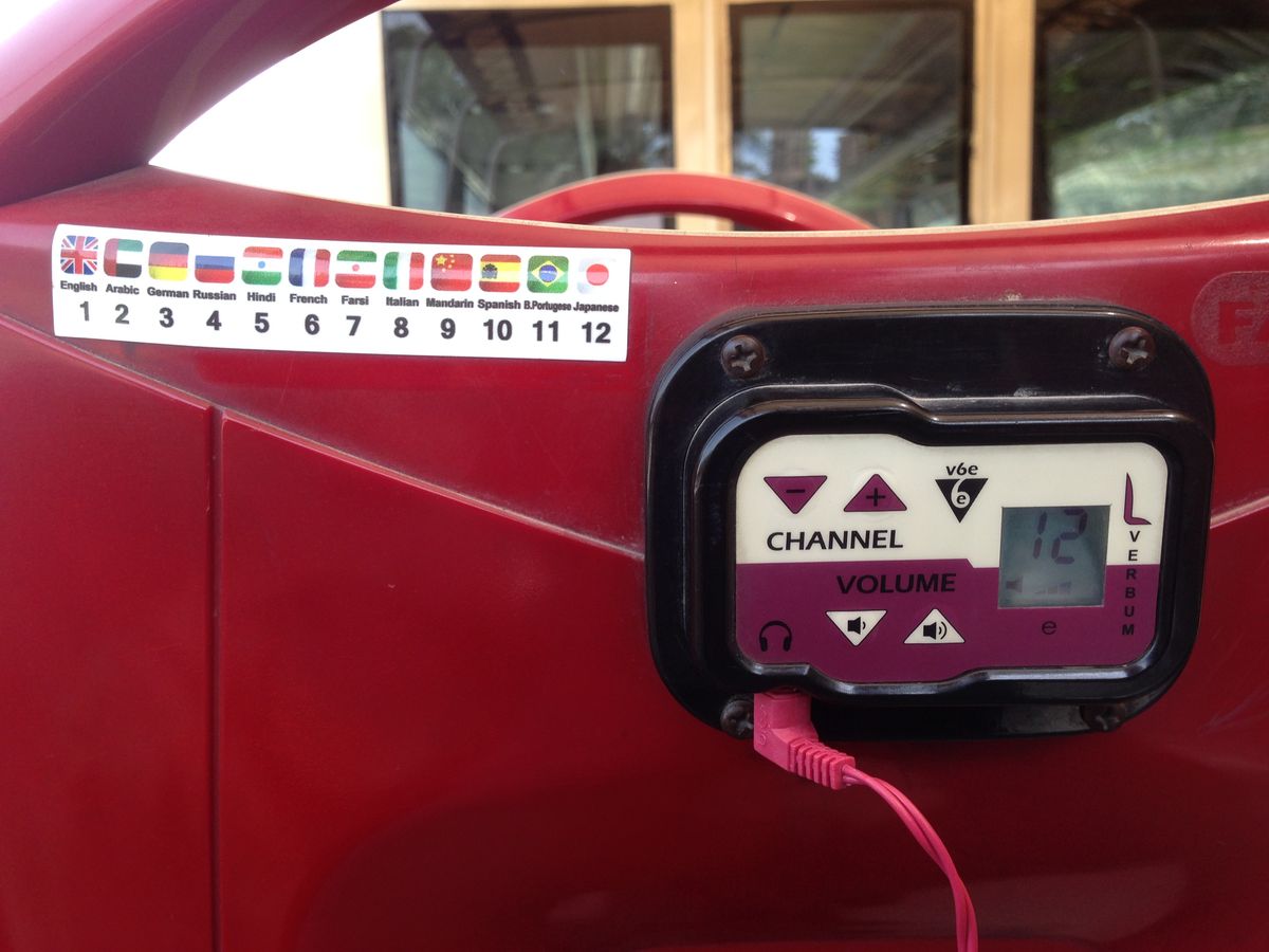 各座席にイヤホンジャックが付いていて、12の言語から選択します(日本語はチャンネル12)。イヤホンは最初に乗車するときにもらえますが、それ以降は同じイヤホンを使わなくてはいけないので、バスを降りるときに必ず持っていく必要があります。