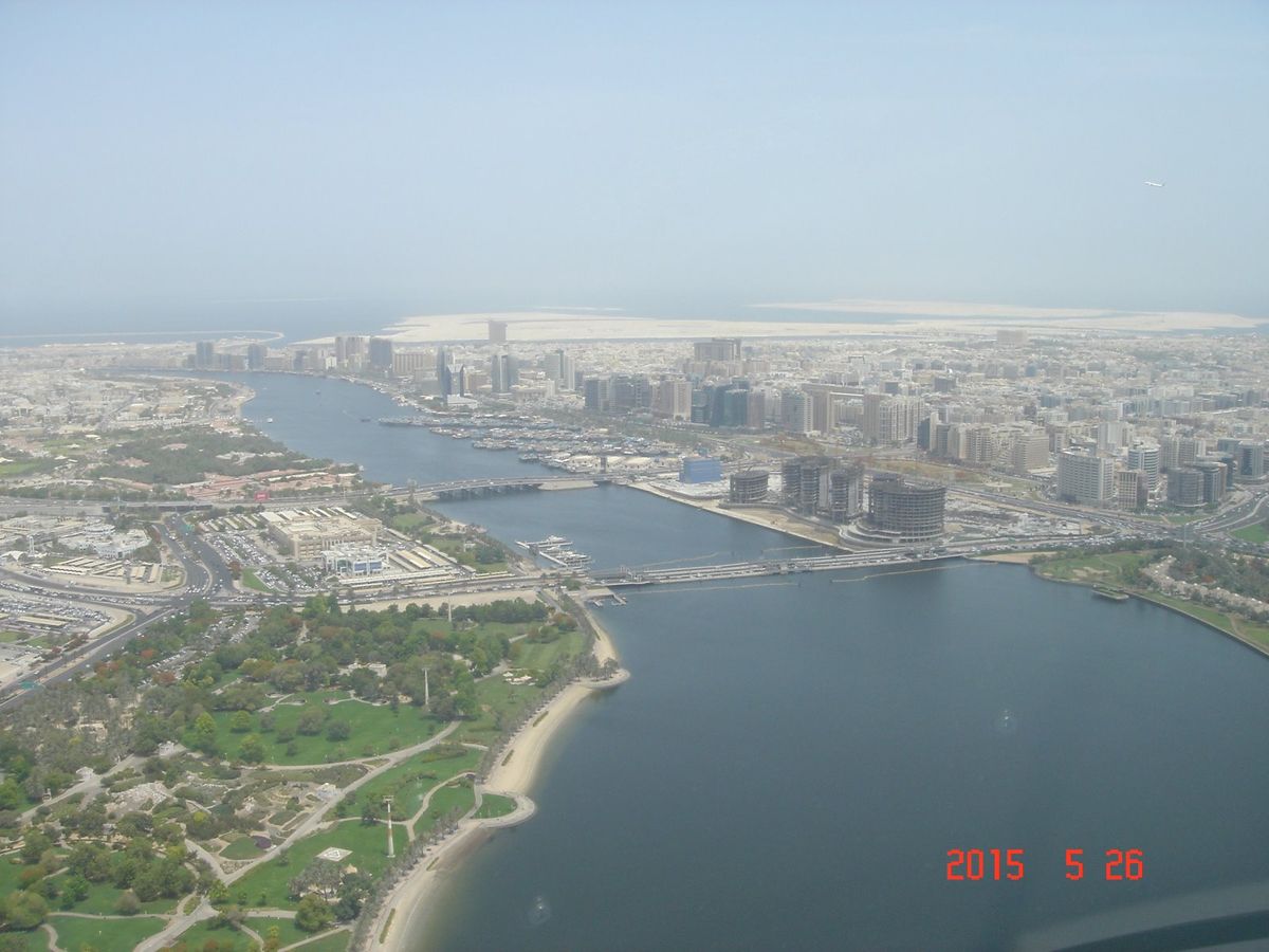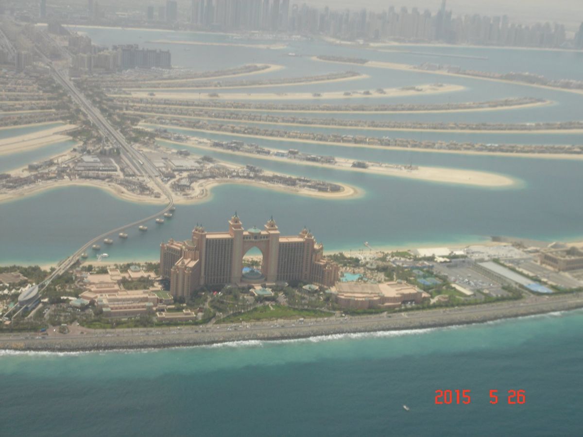 若干の横揺れはありましたが、思ったほどは揺れずに上昇し、バージュカリファを横目にザ・ワールドに向かって飛んで行きます。機体を傾けて旋回しながらバージュ・アル・アラブやパームジュメイラを上からじっくり鑑賞出来ました。空からみるとガイドブックのまんまで超感動!超高層ビルにも負けずにどっしりそびえ立つバージュカリファにも改めて感動しました。