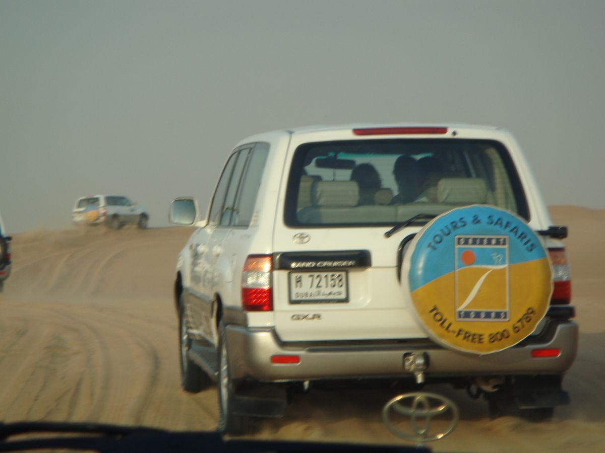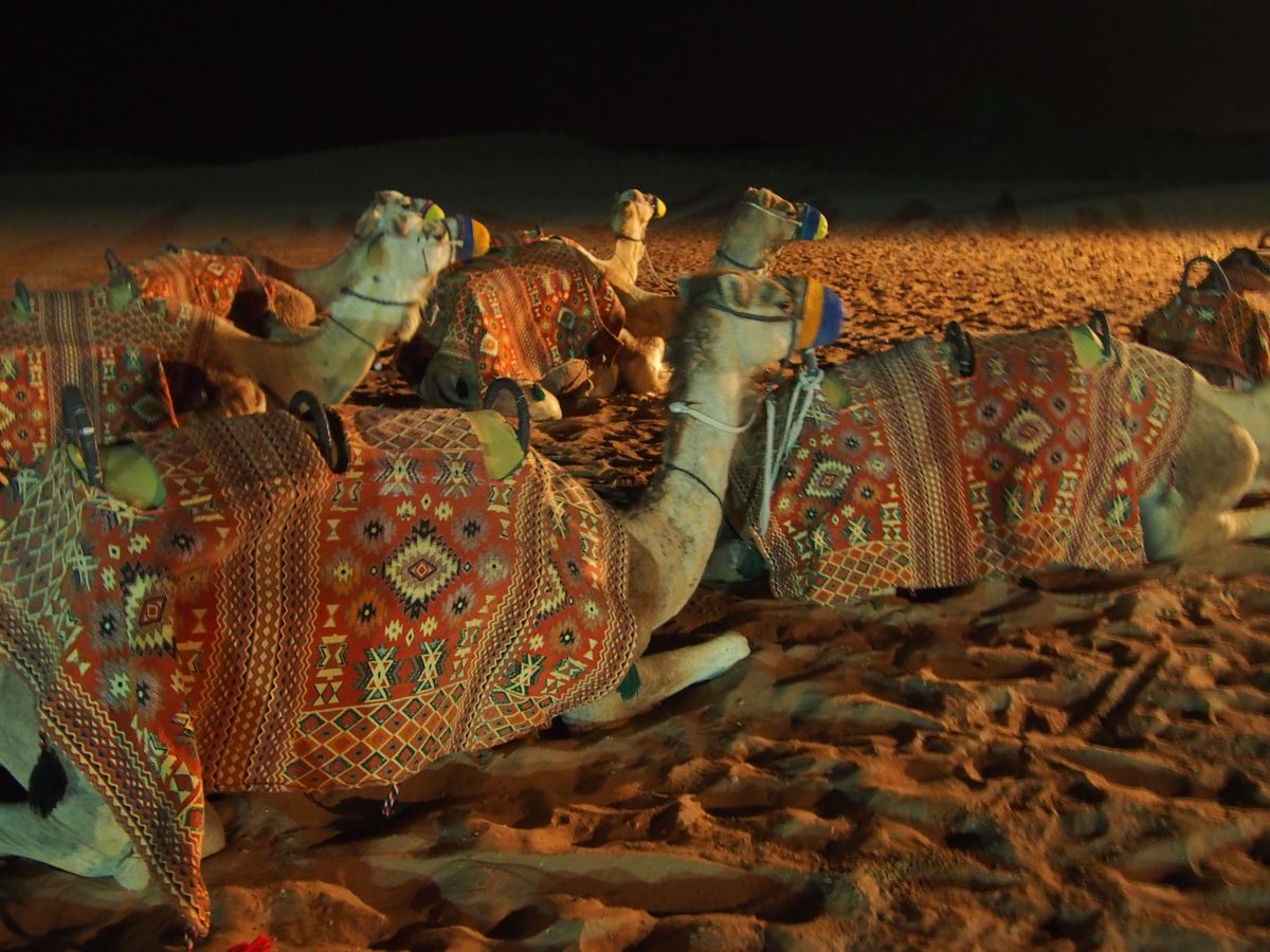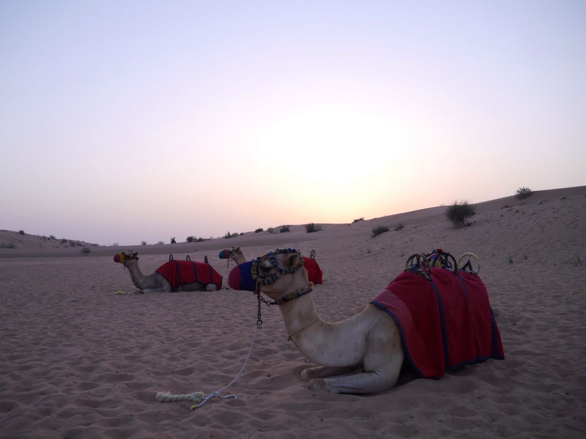 1時間弱のガソリンスタンドで一旦トイレ休憩。その後、砂漠地帯へ。空気を抜くためにここでも15分~20分程度でしたでしょうか、写真タイムを兼ねての休憩(!?)。いよいよ砂漠ドライブ!30分程度降りたり登ったり斜めになったり!車がひっくり返るのでは!?くらいの角度に傾きつつ、爆走!同じ車には私たちのほかに日本人カップルと中国人カップルが居ましたが、ワイワイキャキャーしていました。それからキャメルファームに寄るのですが、ラクダが居るだけで、別に感動もなく・・。ここではラクダは見るだけです。キャンプ地に到着するとラクダ試乗とサンドボードができます。ラクダ試乗はぐるりと一周する程度。サンドボードはやりませんでしたが、楽しそうでした。
