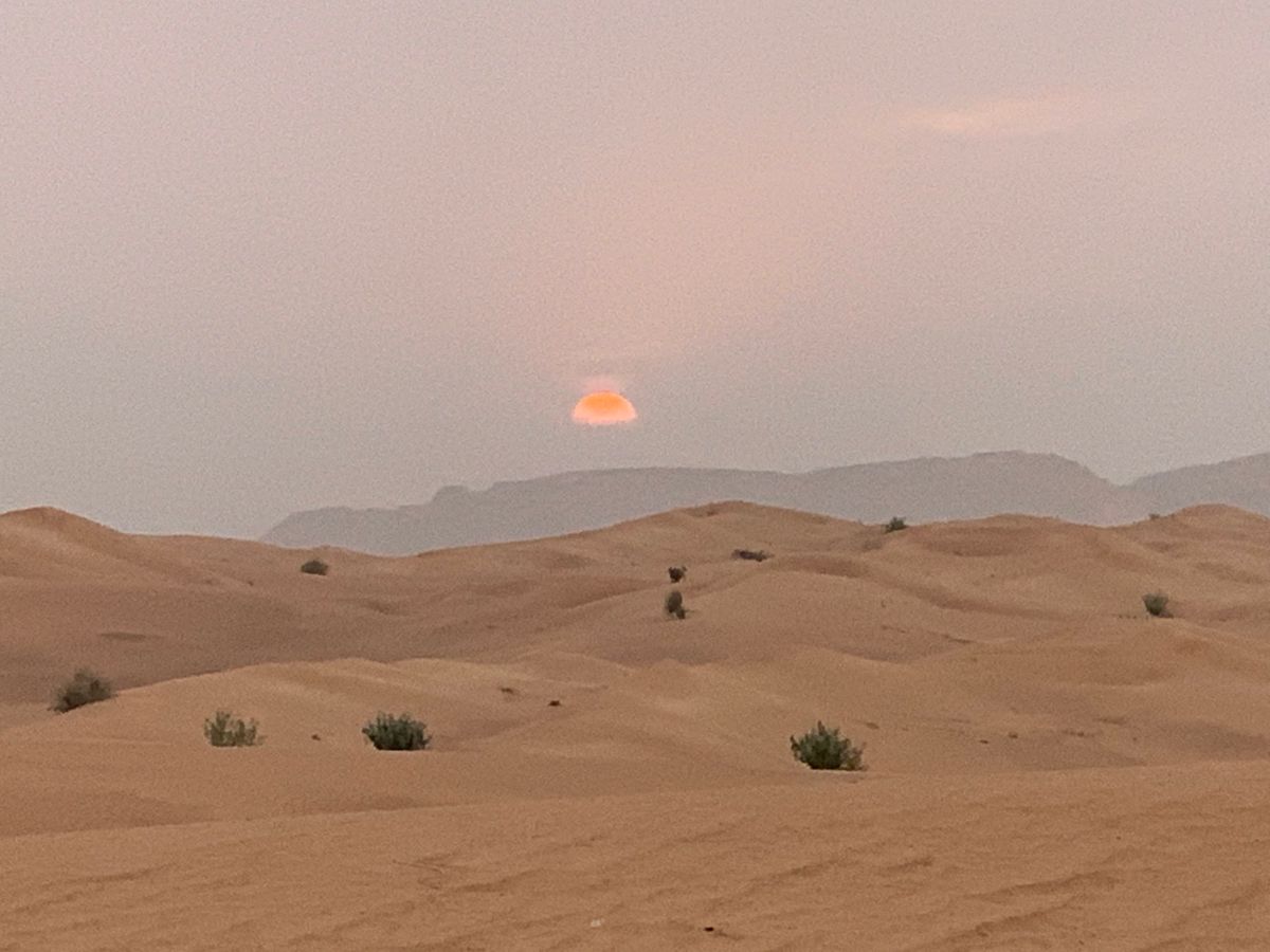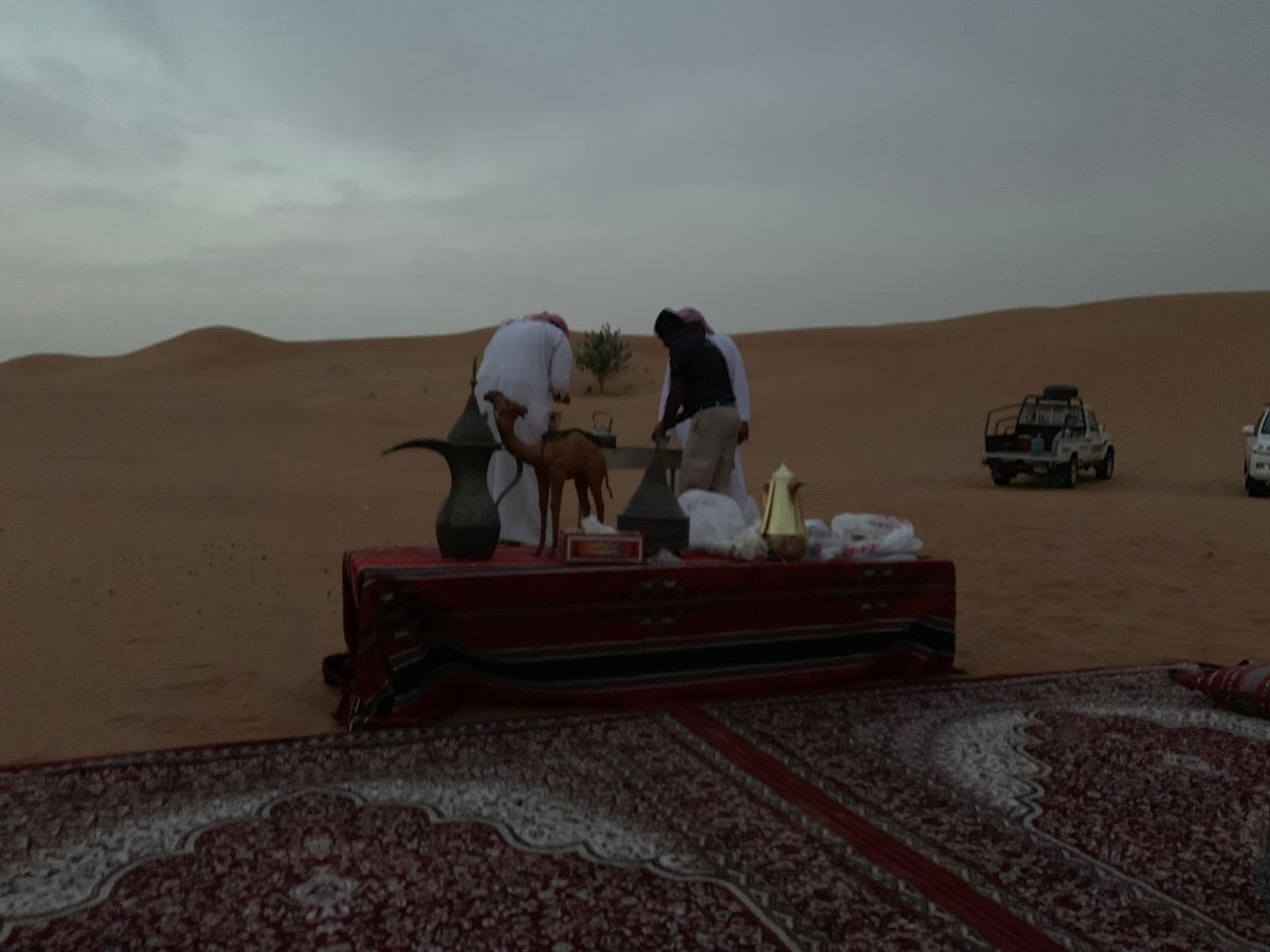 ドライバーの方は10分前にはすでに待っていて私たちが行くとすぐに気づいてくれました。外はまだ暗い中砂漠へ向けて出発。1時間程で着きましたがドライバーの方もカタコトの日本語を喋って和ませてくれました。現地に到着し八畳程の大きさの絨毯に座ってアラビックコーヒーと軽食で日の出を待ちます。私たちはホテルに戻ってから朝食ビュッフェを食べる予定でしたのでそのまま持ち帰りました。参加者は別に1組の外国人カップル。あいにく曇りがちではっきりと太陽を拝むことは叶いませんでしたが見渡す限りの広大な砂漠の中幻想的な空気に包まれ感慨深いものがありました。そのあと約10分のデザートサファリ。私たちに合わせ軽めにしてくれました。夜の賑やかな砂漠が合わないという方はしんと静まり返った神秘の砂漠を体験してみたらいかがですか。