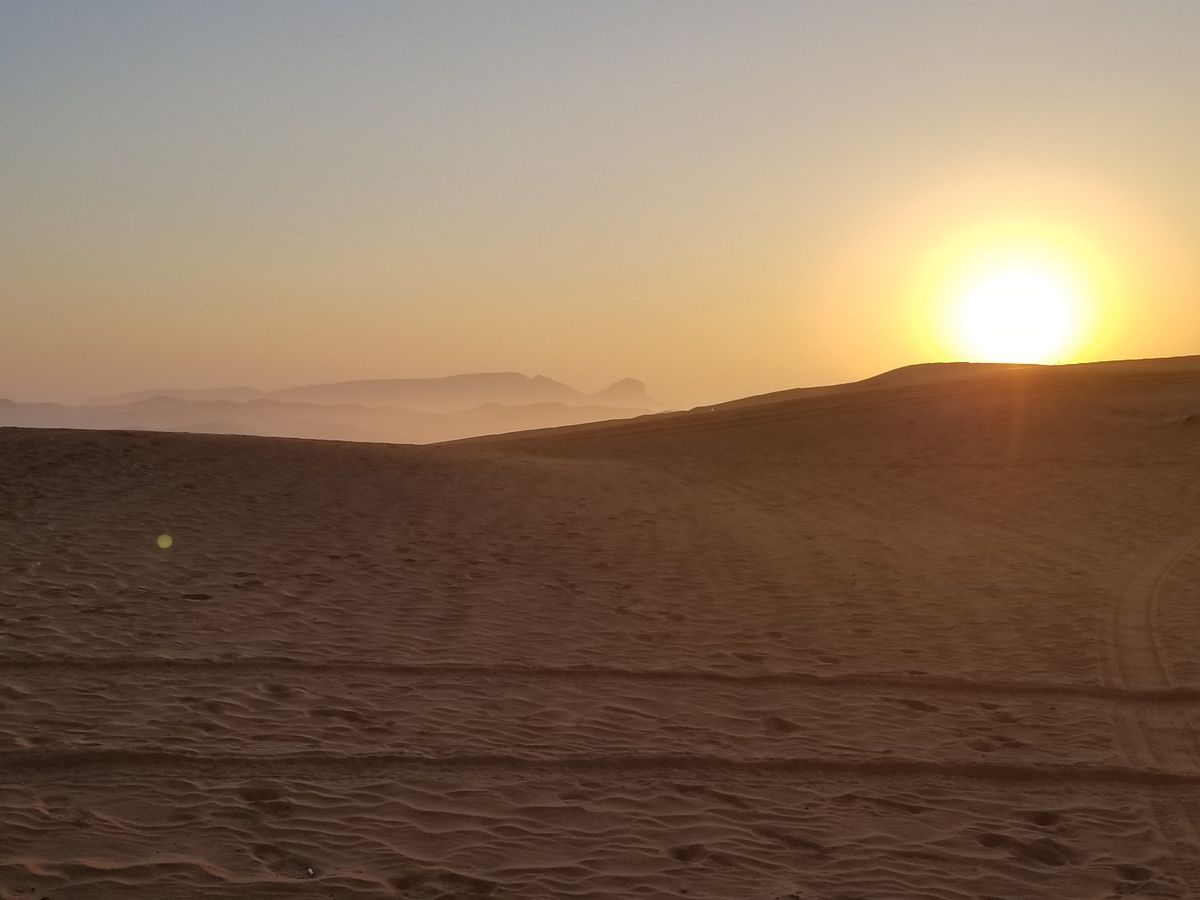 広い砂漠に大きな太陽が昇る静かな時間、心が洗われます。
