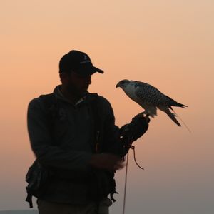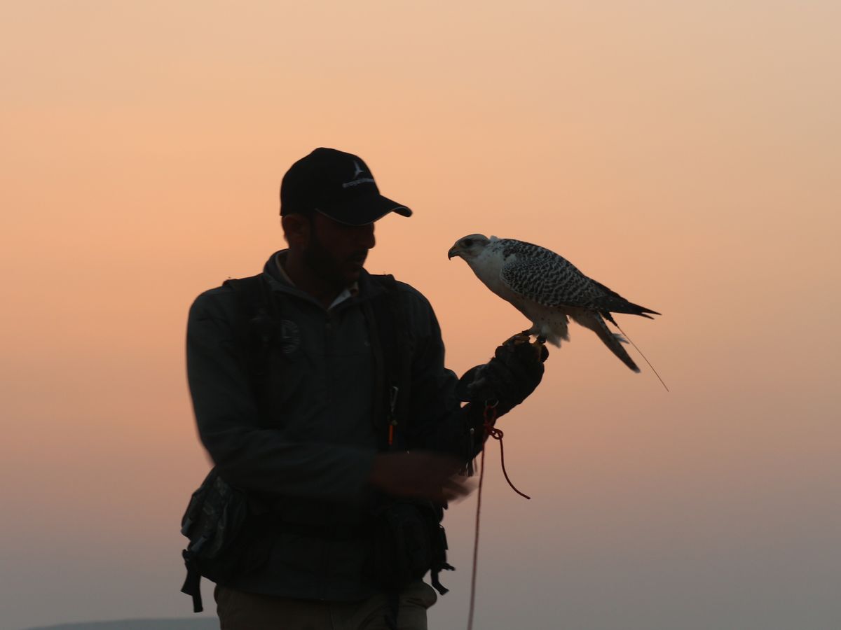 出発時間は、前日にホテルへメールが届き、当日も時間通り(5時)の迎えでした。日の出までは、ファルコンショーを見て鷹を腕に乗せて写真撮影したり、朝食(結構美味しいサンドイッチ・バナナ・りんごなど)を頂いたりして過ごしました。温かいコーヒーが嬉しかったです。でもやっぱり、砂漠の地平線から昇る朝日の神々しさは最高でした。