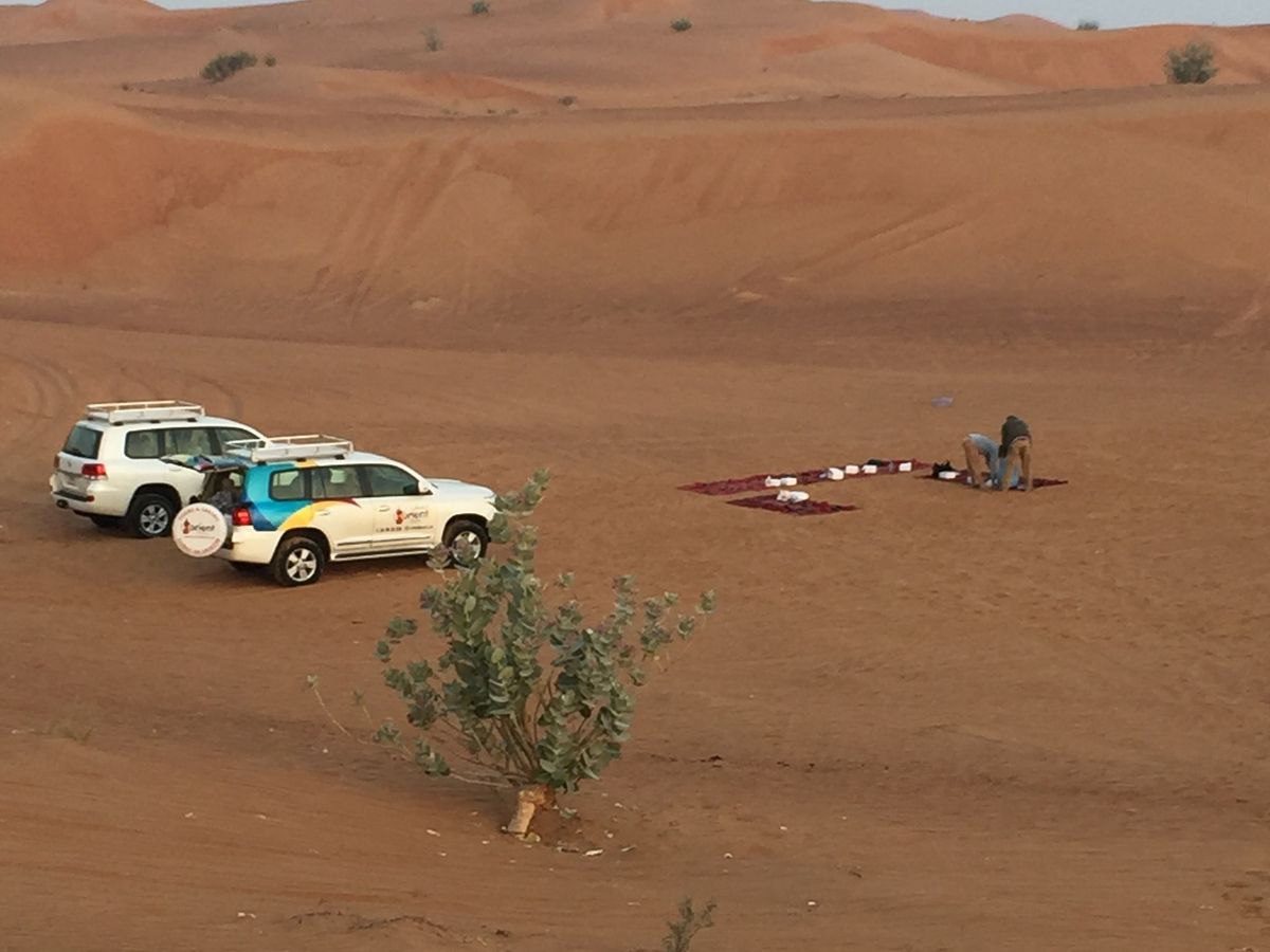 滞在中のホテルにピックアップの時間にガイドさんがお出迎え。6人乗りの車に乗り込み、外国人の家族をさらに迎えて、1時間ぐらい移動。砂漠到着後、写真タイムが少しあり、砂漠を車で爆走ー!落差の激しいところや、登りきれるか微妙な丘を走るのはスリル満点です。夕食前にタカのショーを見たり、ラクダに乗ったりと自由行動。いろんなことを少しずつ経験させてくれます。夕食はまぁまぁです。全体で70人ぐらいいるので、並ぶのが面倒です。スタッフは皆さん優しく、一緒に写真を撮ってくれたりと至れり尽くせりでした。