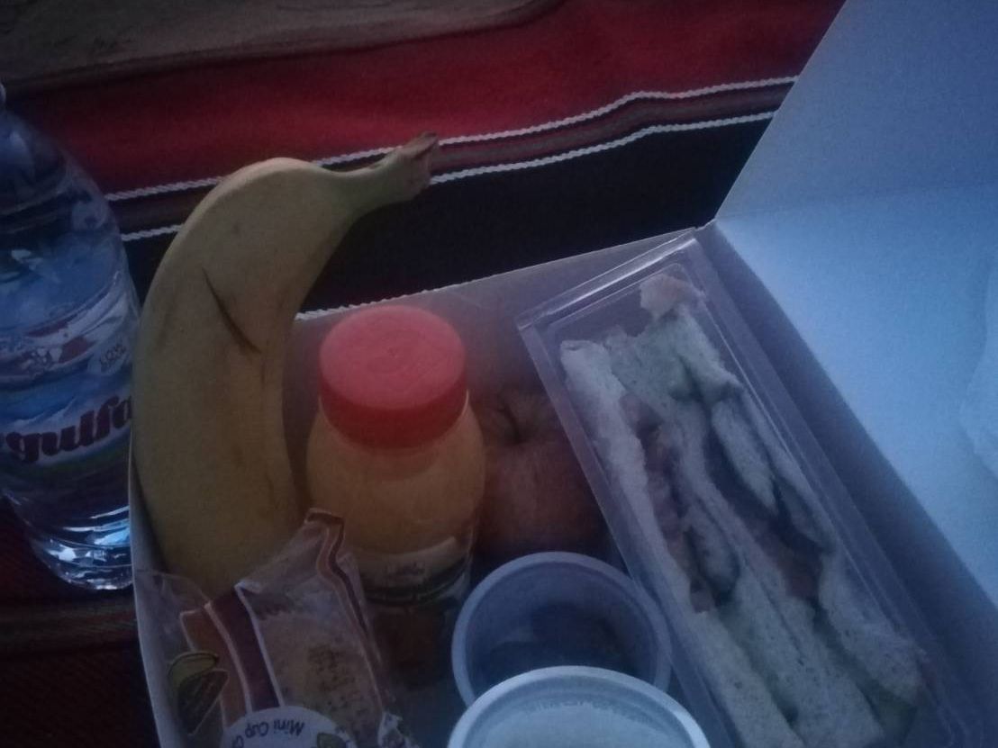 薄い絨毯を敷いてくれ、「ブレックファースト」と言ってサンドイッチ、バナナ、林檎、ジュースなどの入ったボックスとペットボトルの水が配られました。まだ朝食には早いのでそれはお持ち帰りにしました。