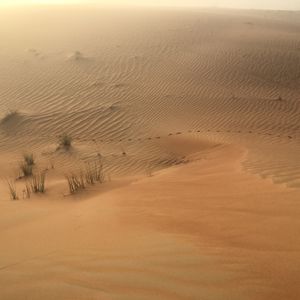 ドライバーさんの入れてくれた熱いコーヒーをいただきながらファルコンを連れた人の説明(英語)を聞き、ショーを見ます。そしてファルコンを腕に乗せた調教師と写真撮影です。そうこうしていると空が明るくなってきて、皆さん砂漠の丘に登ったりして、まだキレイな波形の模様の所に自分の足跡を付けたりして(気持ちいい)写真を各々撮ったりしています。ドライバーさんの「リターン」の声で車に。砂丘ドライブの始まりです。始めの頃は割と軽めだったのですが、私達が「キャーキャー」言っていると「エンジョイ?」と聞かれたので「エンジョイ!」と答えたら急にスリル満点の運転に、とても楽しかったです。