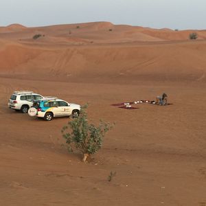 でこぼこ道や急斜面、ジェットコースターのようにスリリングなドライブを楽しめました!鷹との写真やサンドボードも無料でした。朝の砂漠はとても寒かったので、ストールのようなものがあればよいと思います。
