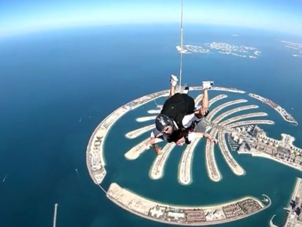 私はとっても怖くて、日本にいる時から、やめとこうかなとか、午前中の気球のツアーが延びて、できなくならないかな、なんてちょう小心者の典型でした。しかし、ダイブセンターに近づくにつれ、ひっきりなしに降下しているのがみれます。それを見ただけで、あっ自分でもできるんじゃない?って気持ちになりました。スタッフは三十人程度、動きにムダがなく、さっさとパラシュートを畳んでカメラなど装着し、出ていきます。なんと頼もしい。さらに私はラッキー。めちゃくちゃガタイのいいインストラクターに、先におりるカメラマンさんはちょうべっぴんさん。怖くなったら彼女をみつめよう作戦が功を奏しました。ぶじダイブ、トムクルーズになりました。パラシュートが開いてからは、風に揺られながら鳥のような気分。パラシュートの操縦もさせてもらいました。繰り返しになりますがドバイの景色は海とパームジュメイラ、近代的な建物の調和、ドバイならでは。十分堪能しました。ダイブ経験者も初心者もちょうおすすめです。