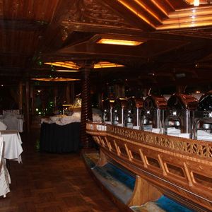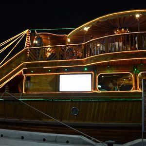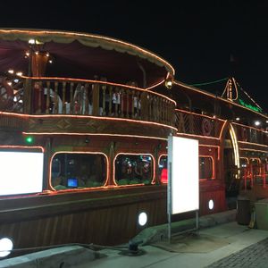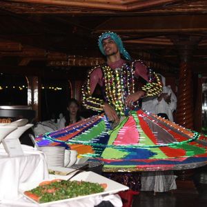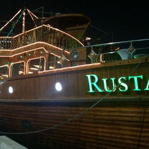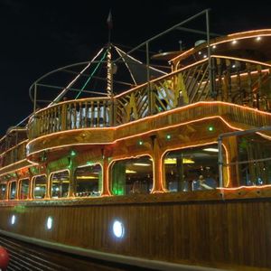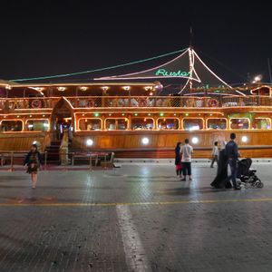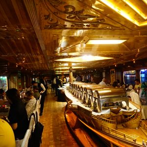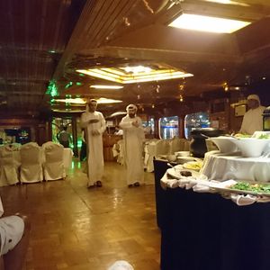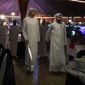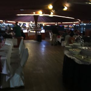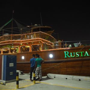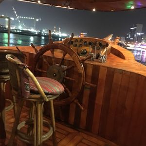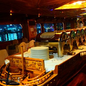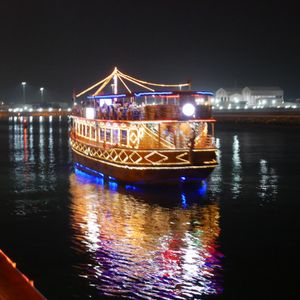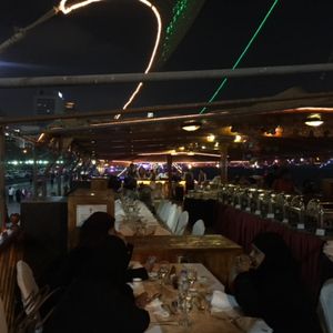 1/1の参加でしたので、1階席も2階席もいっぱいでお料理もパフォーマンスもそれぞれにありました。席は入船してから、選ばせてくれました。足の悪い相方の分まで食事をとらないといけなかったので1階にしましたが、窓からドバイの夜景が見れて、よかったです。1階席は人も少ないので、かえってうるさくなくてよかったです。2階席にするかどうかは、夜の気温と考えて決めたらよいかと思います。食事はアラブ料理でした。そこそこおいしかったです。服装は特に華美にしなくても肌さえ大きく露出しなければ大丈夫でした。1/1でたくさんのお客さんがいたせいか、飲み物を配ったりが追い付いていないようなので、言えばもってきてくました。残念だったのは入船時に写真を撮ったのですが、写真をもらっている人たちとそうでなかった人たちがいて、私たちはもってこられませんでした。買い取りでもOKだったのですが。帰るときは、乗ったバスにわからずに、スタッフと思われる人何人かにホテル名を言って、乗車するバスを探しました。まあうまく乗れてよかったですが。事前に案内があると良かったかもしれません。簡単にアラブの夜と食事を楽しみたいと考えるならおすすめです。