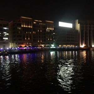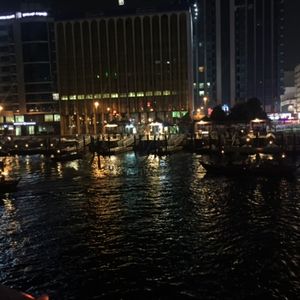 Dubai発のダウ船クルーズに参加してきましたー。宿泊先のコンラッドドバイに時間通りにお迎えが来てくれて、ハイエースのロングに皆んなで乗り合いになって運んで頂きました。英語が出来ない自分ですが、周りの外人さん達は気さくに笑顔で応対してくれるので、以外と安心でした。ドバイクリークの対岸に着くと、乗船前に記念撮影(有料)で始まります。丁度バレンタインの日でお花を奥様が頂きました。素敵なサービスでしたね。席は、自分達は2階席だったんですが、気温的にもそんなに寒くなかったので、開放感があって良かったです。食事はバイキング形式で、ウェルカムドリンクが始まり、その後、出航と同時に食事を取りに行けました。これは、躊躇しないで、素早く取りに行った方が多少列をなすので良いでしょう。食事をしながらのエンターテイメントショー(歌、剣を使ってのアラビックダンス?、回転ダンス)で、終演を迎えました。全体的には、良かったと思います。