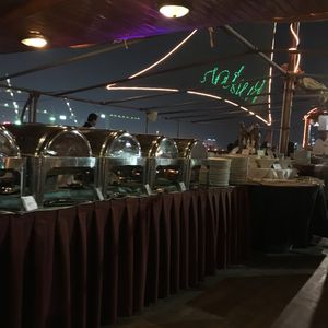 ウエルカムドリンク(オレンジジュース)をいただき、料理ができるまで、2階の船上にあがり夜景をみましたが、外は夜でも暑いので10分ぐらいで船内に戻りました。5分ぐらいしてディナービュッフェが始まり、一斉にビュッフェの列にみんなが並び始めます。