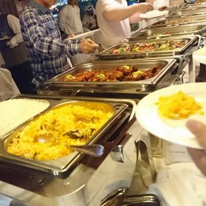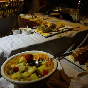ビュッフェはサラダ(レタス、キュウリ、トマト)、アジアン焼きそば、ラムカレー(においがきつくて残してしまった)、白身魚のムニエル(おいしい)、ポテトの炒め物(2種類)チキングリル(スパイス)、黄色いスパイススープ→かぼちゃスープと思ったら少し苦手な味でした)あとは、フルーツ(スイカ、メロン)、スイートポテトのようなお菓子(おいしかったです)がありました。結構みんなすごい勢いで取りに行きますが、料理はどんどん補充されていました。