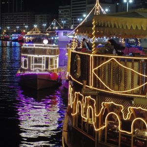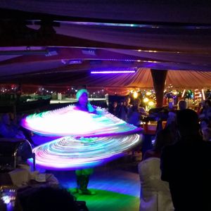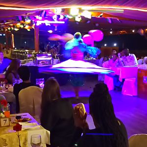 電飾をつけてクルクル回るダンスなどのエンターテイメントもありました。夜のドバイの静かな街並みを見ながら各国の乗船者とビュッフェを楽しめるので、普通のレストランで物足りないという人には是非オススメです。ほぼクリーク内の移動なので揺れも少なく、船酔いしやすい人も安心です!参加したのは3月でしたが肌寒かったので羽織るものがあるといいと思います。