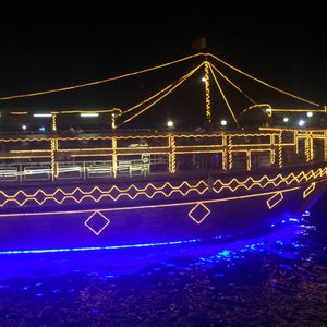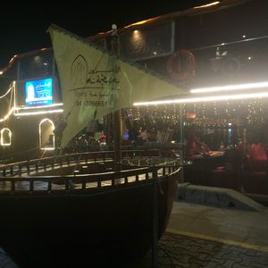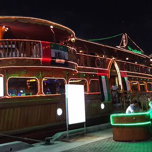 世界最大ダウ船と言うことで、船乗り場に行くと一際目立つ大きな船が停まっており、まずその大きさに豪華さに圧巻でした。期待と緊張のもと乗船するとスタッフが入口でまず写真を撮ってくれて、笑顔にしてくれ安心しました!そして、すぐ二階席へ案内してくれ、着席後はソフトドリンクを提供してくれ親切でした。出航が21時なのでそれまでドリンク飲んで夜景を見て出航まちです。ここの間の景色がとても綺麗で待っている時間も気にならずでした。21時になり出航するとアナウンスが入りバイキングのディナースタート!アラビアン料理でどれも美味しく何度もお代わりに行ってしまいました!しばらくすると、またスタッフがアナウンスしだし、ショータイムスタート!まず綺麗な女性が歌をうたいだしとても上手で聞き惚れてしまいました。その後は民芸ショーなどもありダンスショーがすごく圧巻でした。船からの景色はまた格別なものでした。クルーズからの風邪も心地よく、夜景の景色も街全体がイルミネーションしてるかのように光が灯って、また行き交う他のクルーズもライトアップしているのでそれもまた綺麗で見所のひとつでよかったです。約二時間のクルーズはあっという間でドバイの夜景を船から堪能できちょつと優雅な時間のなかアラビアンナイトを楽しめて良かったです。