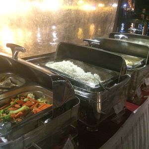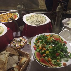 食事はアラビアン料理を中心としたビュッフェです。サラダ、メインディッシュ、デザートとテーブルが分かれております。種類も20種類以上あり、豊富でしたので、満遍なく少しずついただきました。ランク的には並みのビュッフェだと思います。