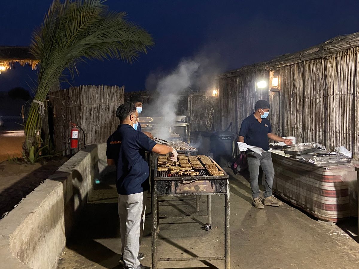 別の会社(Orient tours)が催行する砂漠の中のキャンプサイトへ移動してのダンス鑑賞(ベリーダンス等)及び夕食(BBQ:スタッフさんが当日焼いてくれたお肉ビーフパテ、ラムチョップ、マトン、チキン、サラダ等など)、食事は大人は食べれるが小学生以下のお子さんには少し食べづらいかと思います。事実、うちの子どもはほとんど食べてませんでした。