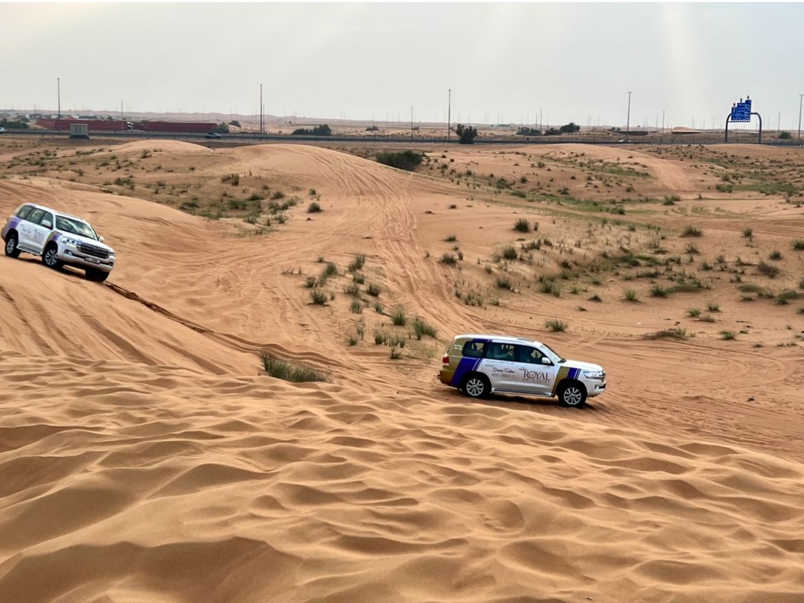 ランクルで高速に乗り砂漠に向かいました。砂漠を激走するアクティビティは、酔い止めを服用していても若干酔いましたが、とても楽しかったです。車内は大盛り上がりでした。