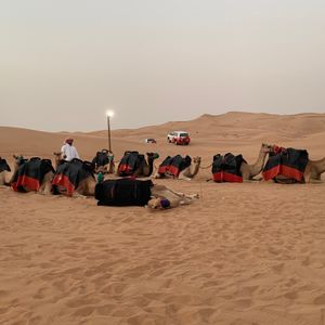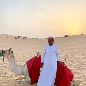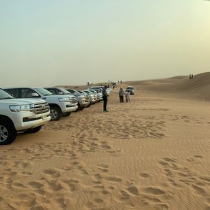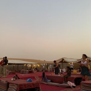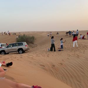 ラージさんという方が案内してくれ、英語ができない私たちにゆっくり話してくれたり、ほかの人たちに説明したあとに個別でまた説明してくれたり写真を撮ってくださったりしました。酔い止めを飲んでも少し酔ったので、酔い止めは必須だと思いました。想像以上に胃がかき回されて体験する前は食べ物をあまり食べない方がいいと思いました。酔って気分を悪くした方がいましたが、車を止めたりゆっくり走ったりしてくれていました。流れとしては1回砂漠に降りて写真を撮り、そのあと砂漠の上をドライブ、夕日を見る所でサンドボード体験(私はやっていないが列が長かった)、その後に食事の場所へ行き、車内の方達と席を確保し、飲み物をもらいに行き、ラクダ、ヘナ、シーシャなどができます。ラクダとヘナタトゥーの体験をしてる人が1番多かった。シーシャは私が行った時は何故か誰も体験している人がいませんでした。煙草吸える場所がありました。