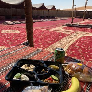 飲み物はいつでも行っていいので所定の場所に行ってカウンターで注文します。無料です。食事はブュッフェスタイルになります。全てのショーが終わった後に食事がスタートする為、ショーが終わったら(私の時はファイヤーショーの後)すぐに取りに行かないととても並びます。料理はBBQスタイルの為お肉中心で美味しかったです。食べる場所は自由席と予約席がありますが、どちらもグランピングの様なオシャレなラグとクッションがあり、雰囲気はバッチリです。その後に伝統的なデザートを取りに行って後は帰りを待つだけです。