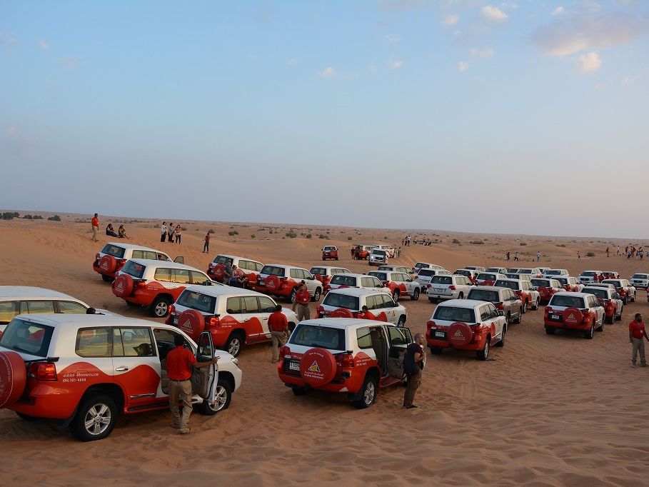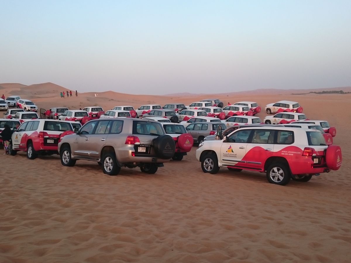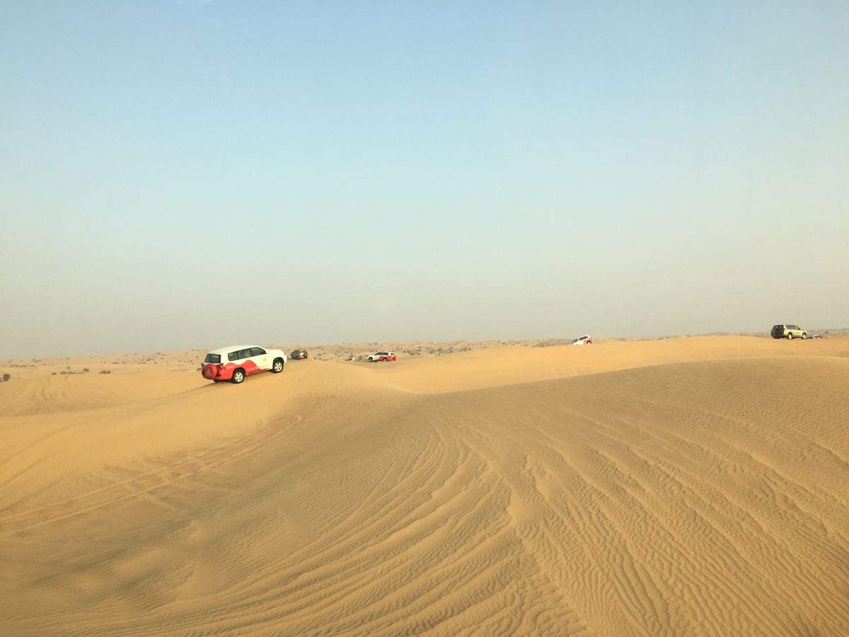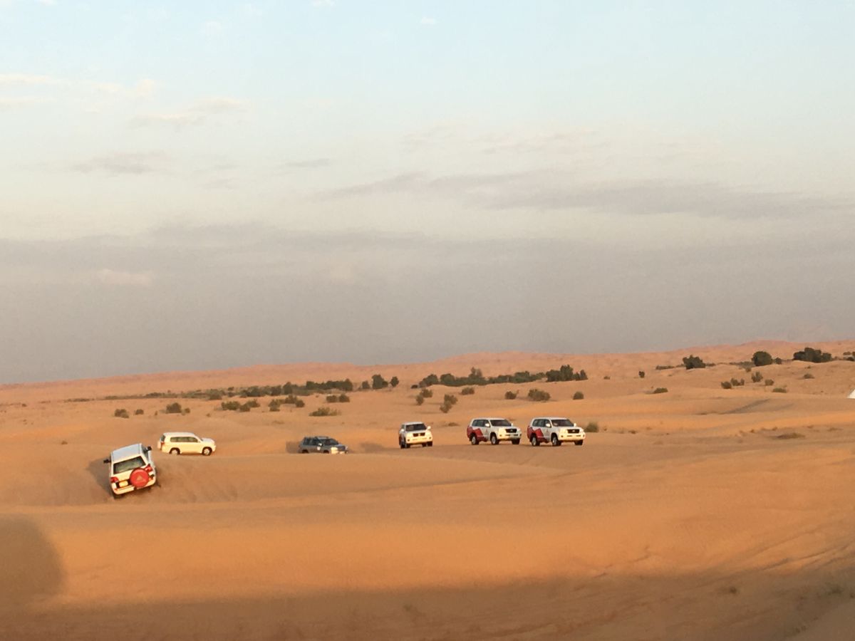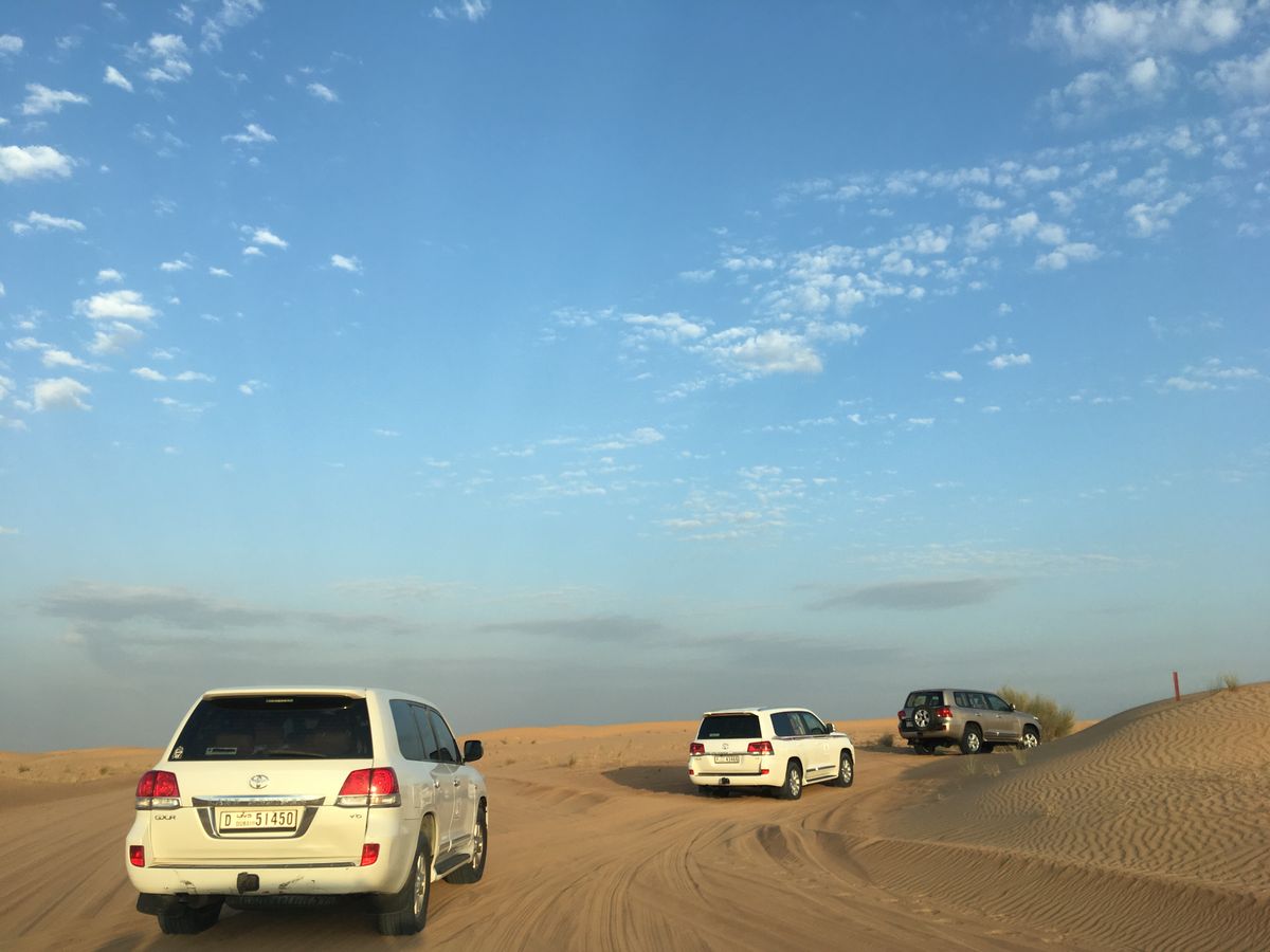 2時にホテルにピックアップしてもらい、そのまま1時間ほど走り10分ほど休憩後さらに40分はしり、一面砂漠地帯へ。そこで9台の車が集まり総勢45名の参加者と9名のドライバーで列になっていざ出発、40分ほどジェットコースターのように砂漠の中を走りまわり、笑いが止まりませんでした。