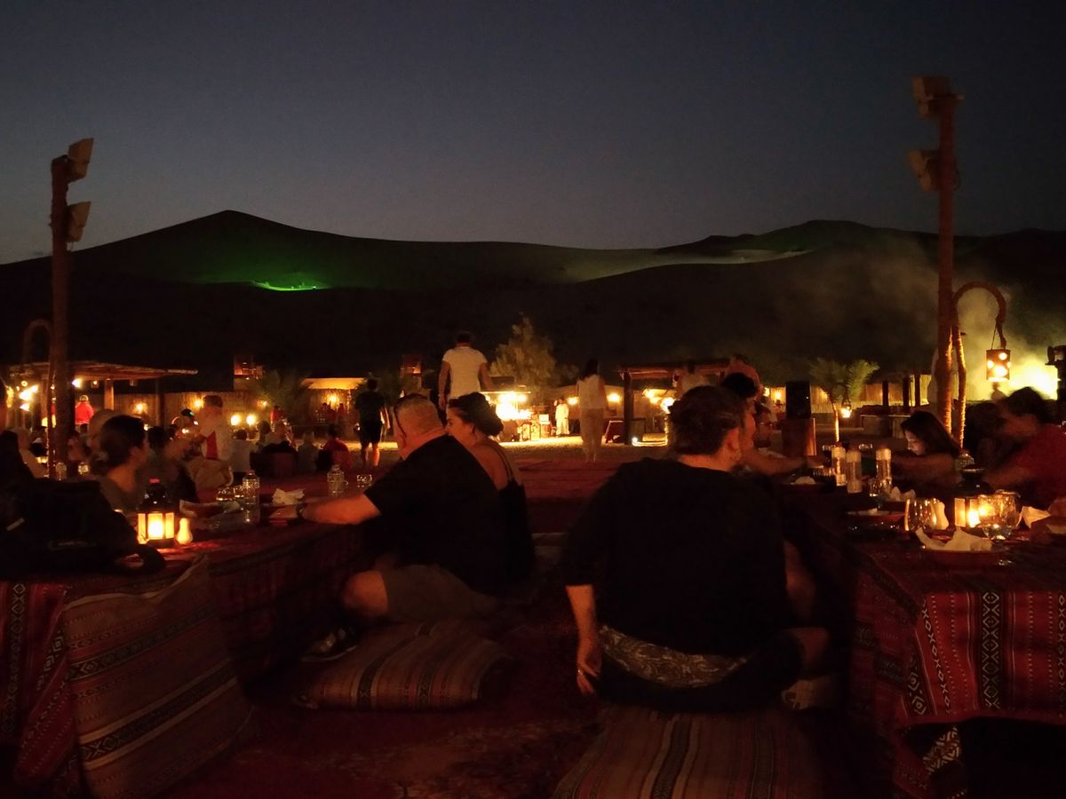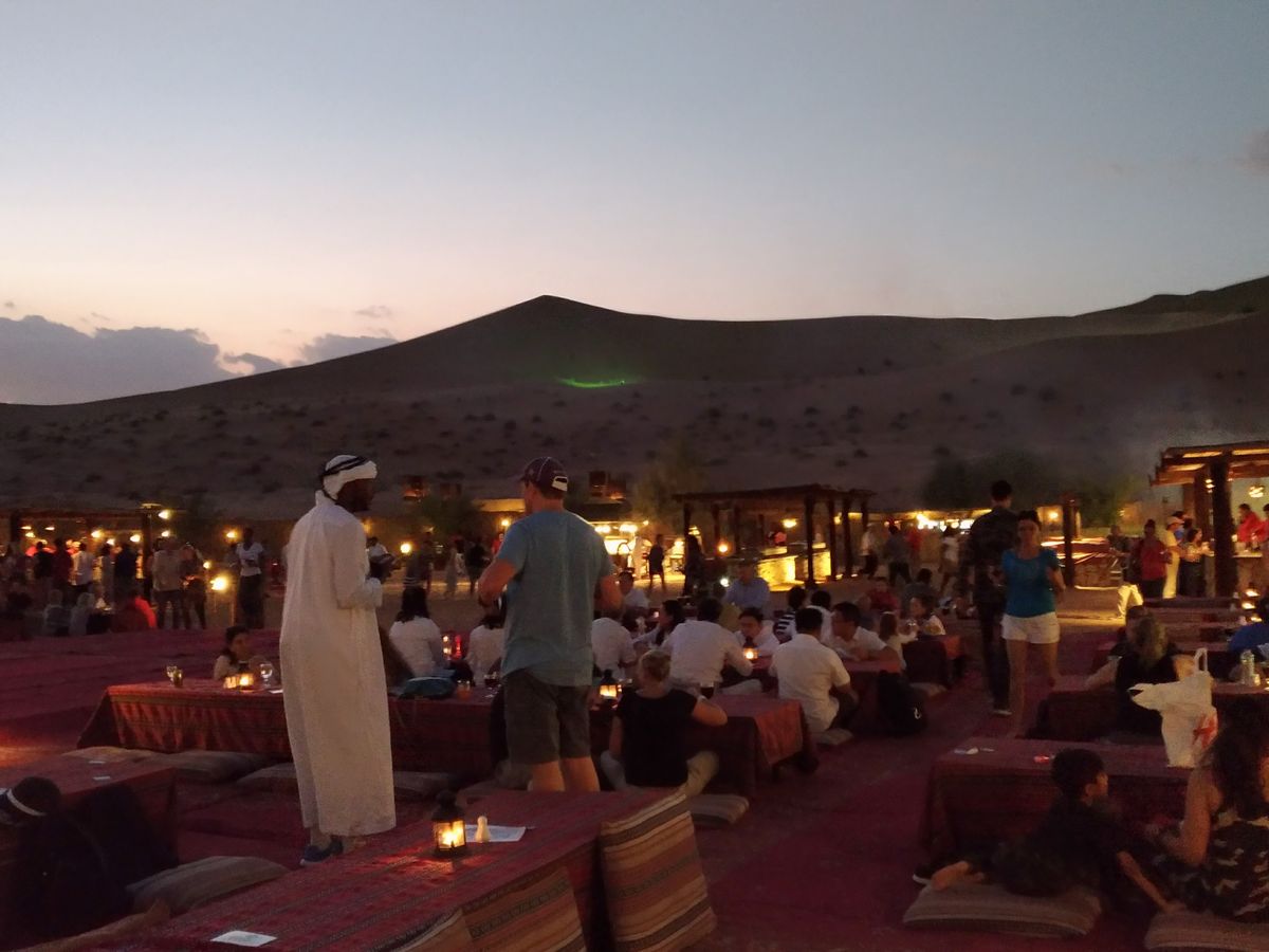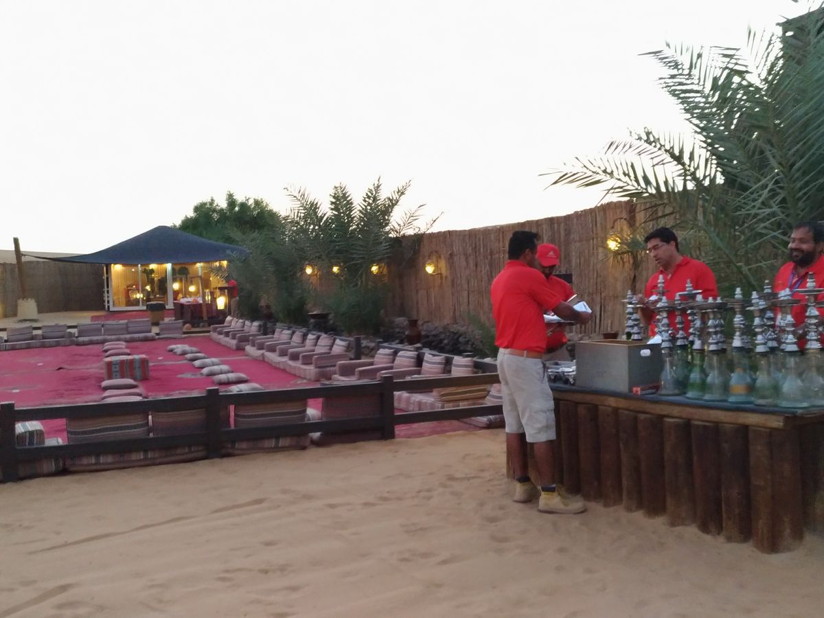 キャンプについてからは、車を降りる前に食事と各エンターティメントの説明があるだけで後はフリーでした。各車のドライバーさんはバーベキューの準備等々に忙しいので、自分で食事の席を確保しつつ、お目当てのシーシャやヘナタトゥなどのエリアを探すことになります。(暗くなり始めると迷いますが、赤いポロシャツのスタッフに聞けば丁寧に教えてくれます)