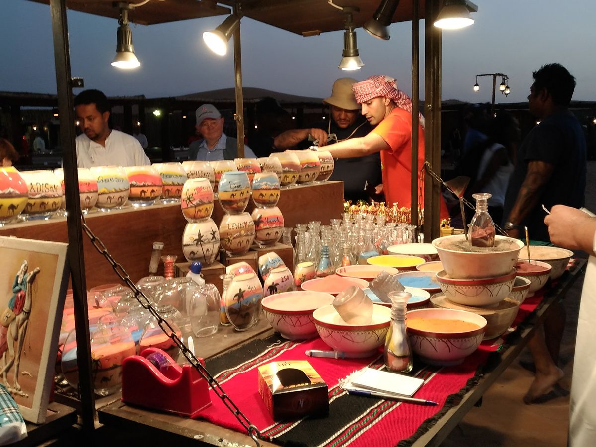 その後、ラクダの集落の場所で写真を撮影したり、途中の砂漠で写真撮影したりして、ショーがある場所へ。そこには、トイレやお土産物屋、食事場所、ショーの舞台がありました。まず、鷹のショーを見て、ラクダに乗り、夕焼けの砂漠をみて、砂のボードをしたり、ヘナタッウーをしました。砂のアートを実演していたので、見入ってしまい、結局購入しましたが、値切って安くしてもらいました。