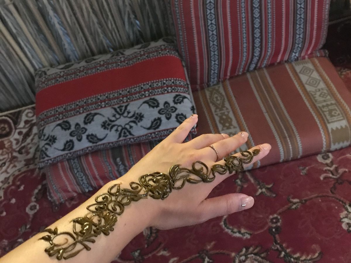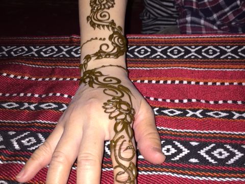 イラク人夫妻、イギリス人女子二人、私たち二人の6人で 一台の車に乗りました。かなり揺れるのであらかじめ酔い止めを飲んでおいて良かったです。途中でペットボトルのお水をもらえるサービスがありました。らくだ乗り、ヘナタトゥを楽しんだあと食事、ベリーダンスが終わったら乗ってきた車に集合です。イギリス人女子のひとりは3回目の参加らしく、食事が前よりも良くなったと言っていました。ヘナタトゥは帰国後のことを考えて左腕の内側にしてもらいました。