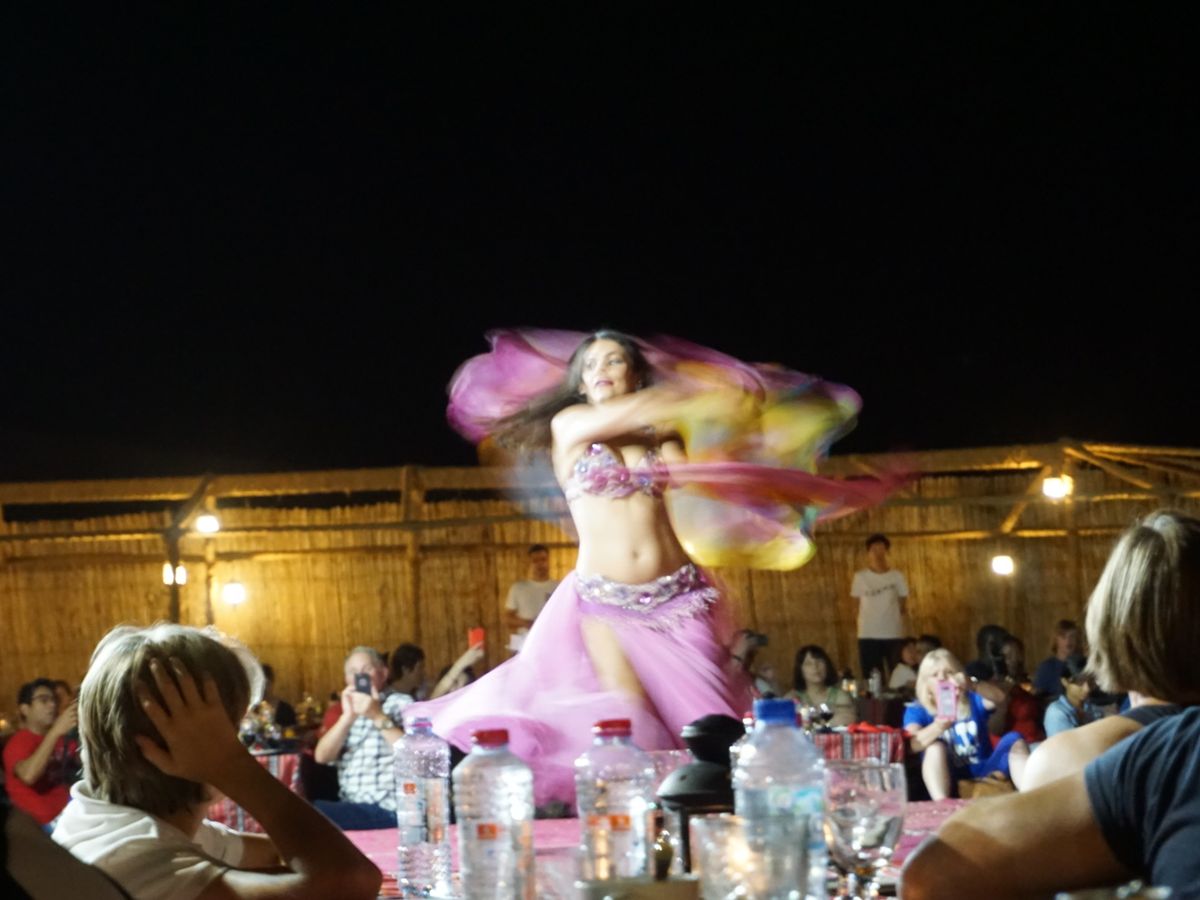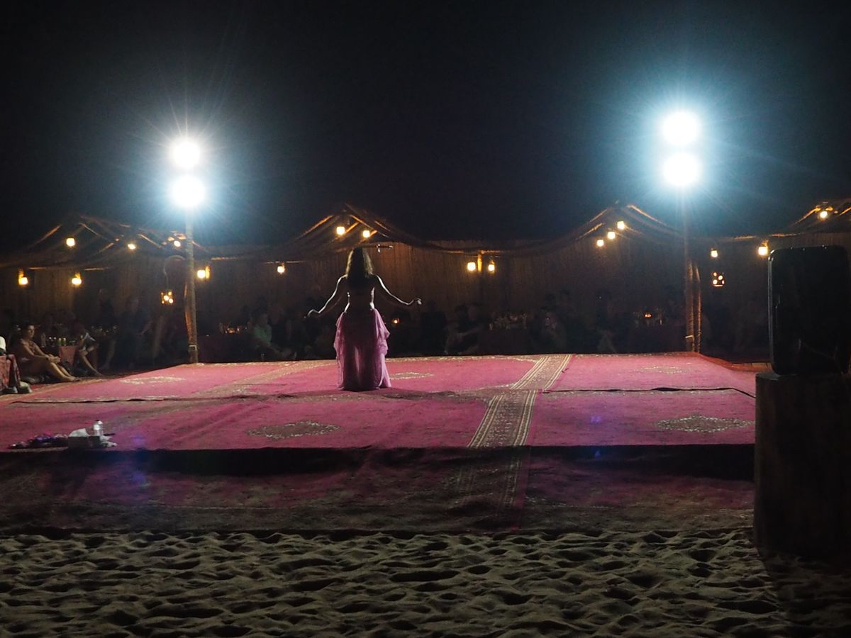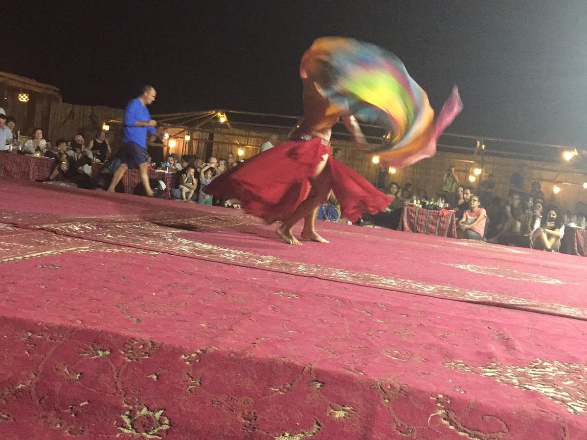 砂漠をランドクルーザーで激走するのは本当に貴重な体験でした。ラクダに乗ったりヘナを体験したり、その後の食事は暑い(夜でも40度!)けどこれまた貴重。踊りを見ながらいただくビュッフェは味もなかなかです。