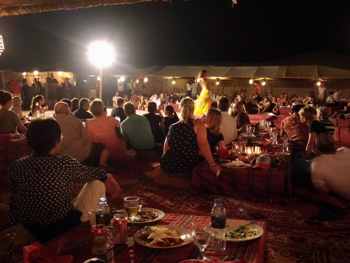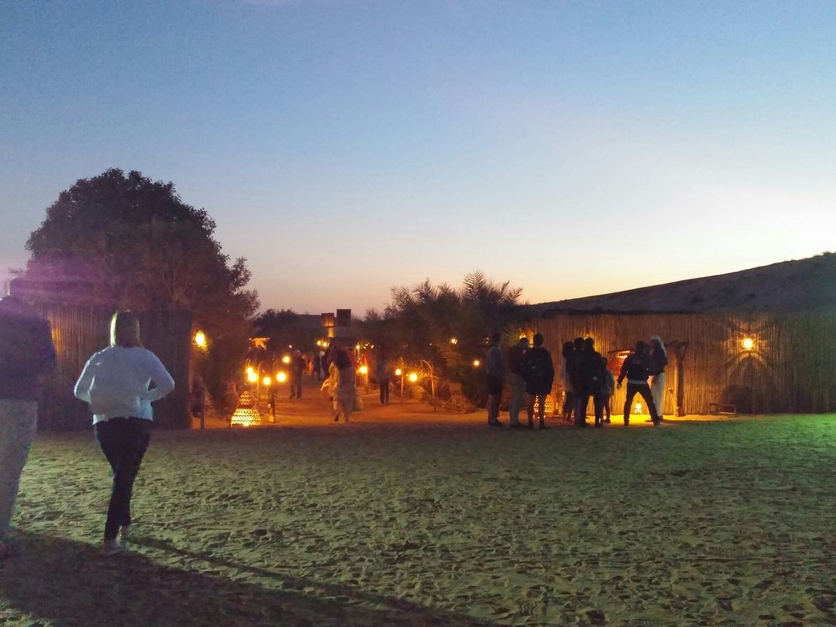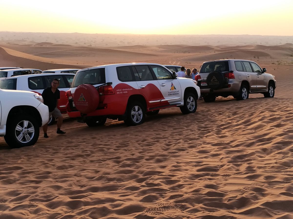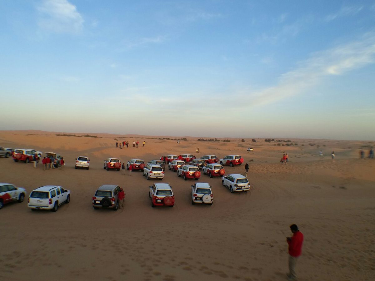 『デザートサファリ・ビュッフェディナー付ツアー』に参加させて頂きました。まずは4WD車のタイヤの空気圧を調整して広大な砂漠へ出陣! 砂丘のアップダウンをジェットコースター感覚で駆け抜けるのは実にスリル満点で、本当に面白かったです。デザートサファリを終えるとラクダ牧場を見学してディナー会場へ。キャメルライドやスノボを体験したり、満天の星空の砂漠でタンヌーラダンスやファイヤーショーを観ながらバーベキューを食べられて最高に楽しい時間を過ごせました。本当に参加して良かったですよ!
