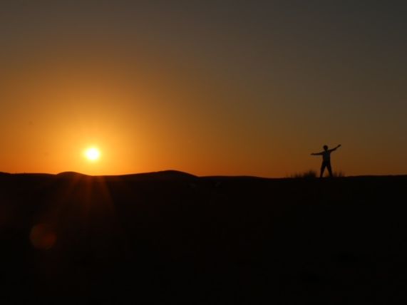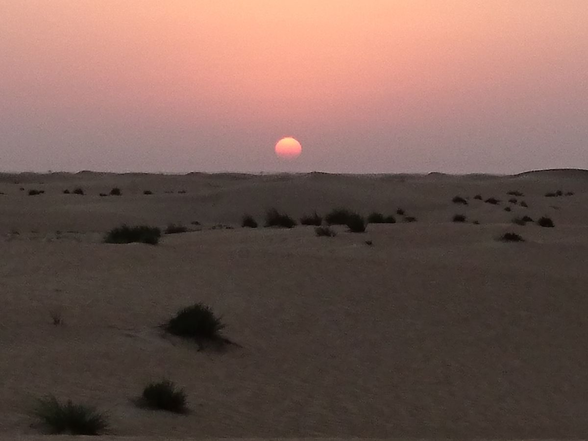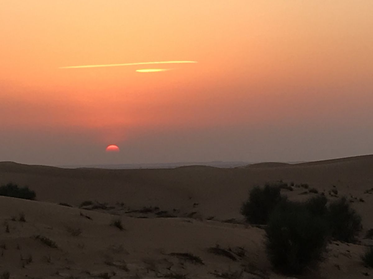 気が付くとあたりは夕暮れ時、砂漠の中に車は止まり、我々は粉のように細かくひんやりした砂に足を取られながら砂丘に上り、遠く砂漠に沈む赤い夕日を眺めました。これ、個人的にはドライブ以上の感動で、このわずかな時間のためだけにでもこのツアーに参加する価値はあります。