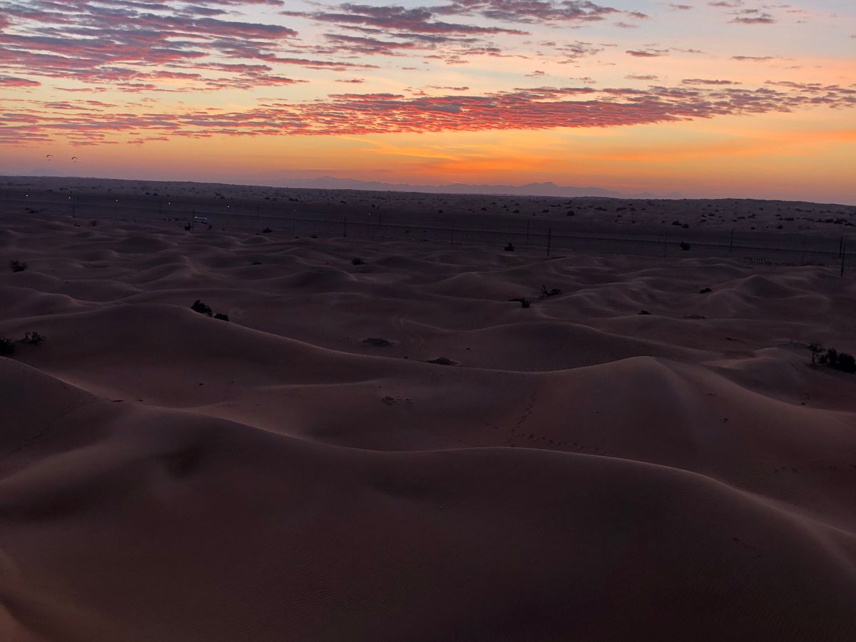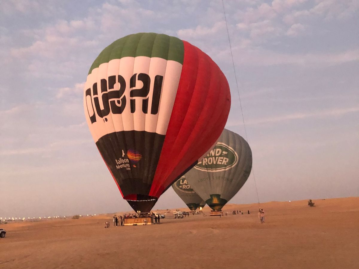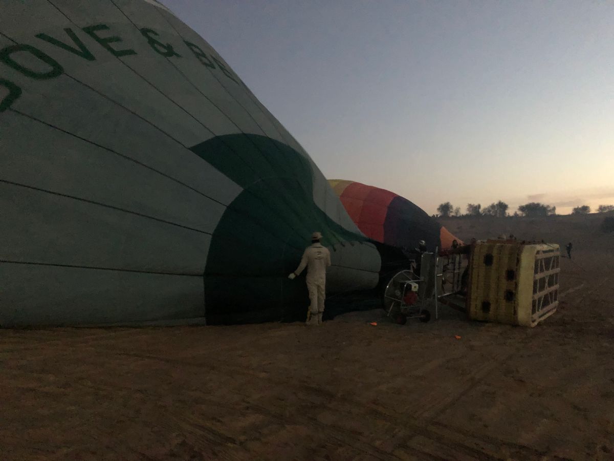 早朝の暗いうちにホテルへ迎えに来てもらい、車中は爆睡。現地の砂漠へ到着し車を降りたら、なかなかの冷え具合でダウンジャケットを着てて正解。気球の方はスタッフさんが準備中で、気球を膨らませる準備も見ごたえあり。スタッフさんからの説明で気球が膨らんだら、スタッフさんの指示で直ぐにゴンドラへ乗り込む。少し風があり気球と共にゴンドラも煽られたが、無事にテイクオフ!朝日が顔を出す前だったので朝焼けの砂丘が、とてもキレイで感動。かなり上空まで登り、周辺を周遊。とても素敵な時間が過ぎて着陸の時間に。離陸した位置に戻りつつ降下していくが、けっこうなスピードが出ていて、予めスタッフさんから指導を受けた着地姿勢をとり、なかなかの衝撃と共に無事にランディング。ゴンドラを降り、朝食の場所へと車で移動し、朝日が昇る爽やかな中で、美味しい朝食をいただきました。